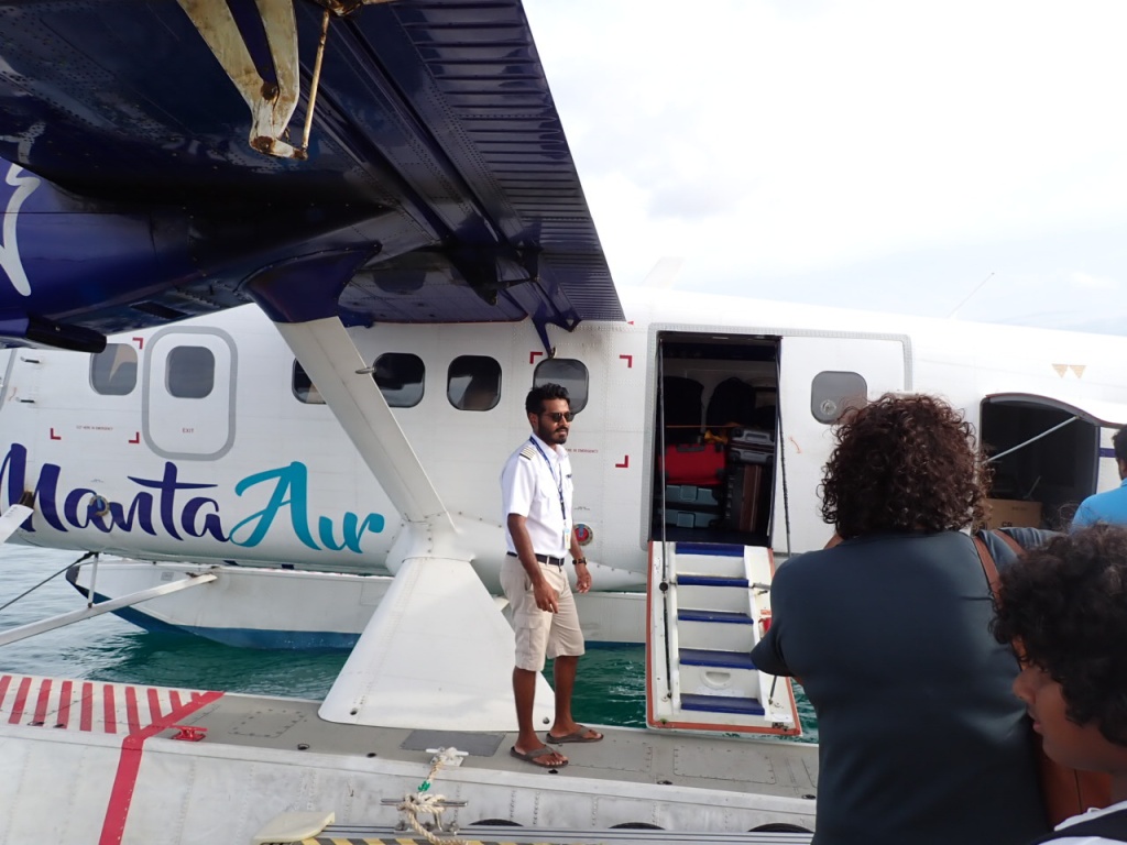 今回は、いつものTMA(Trans Maldivian Airways / 赤&白の機体)ではなく、Manta Airです。