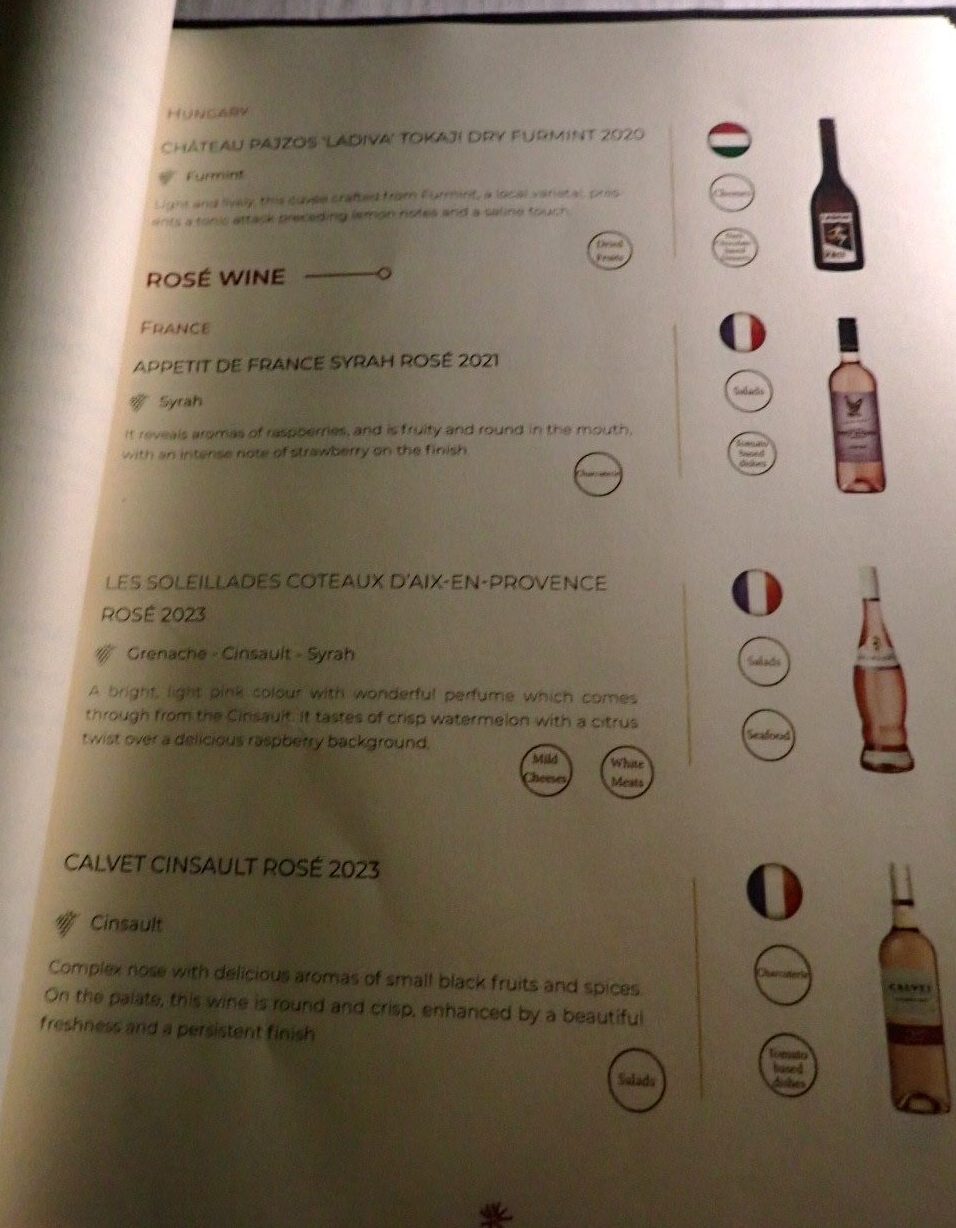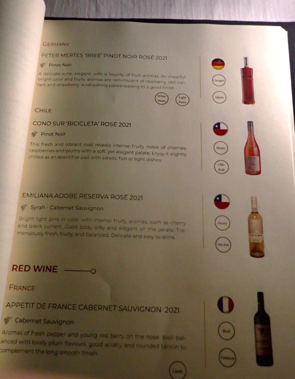 シャンパン、スパークリング、ノンアルコールスパークリング、白、ロゼ、赤、デザート、、その数なんと約7~80種類。もちろんオールインクルーシブに含まれています。