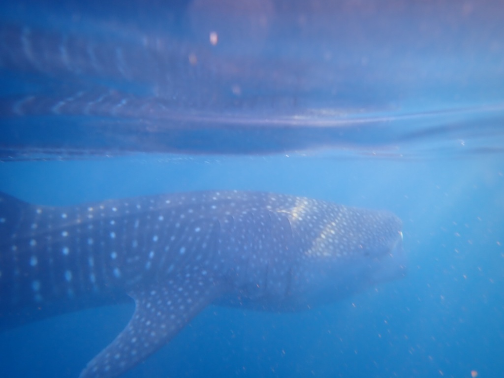 約半分の方は「マンタを見たいので。。」とリゾートへ戻り、4名でジンベエザメ探しに再出発。ボートに揺られること約20分、ガイドが「みんな、準備はよいかい?海にジャンプ!」と声がかかり、急いで海に入ると、、