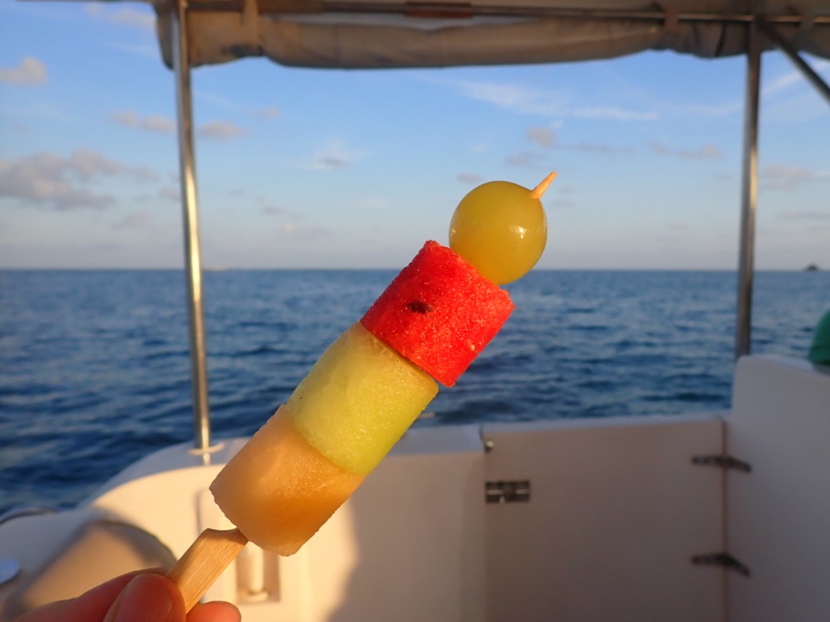 ボートに乗ると、スタッフからfruit skewer