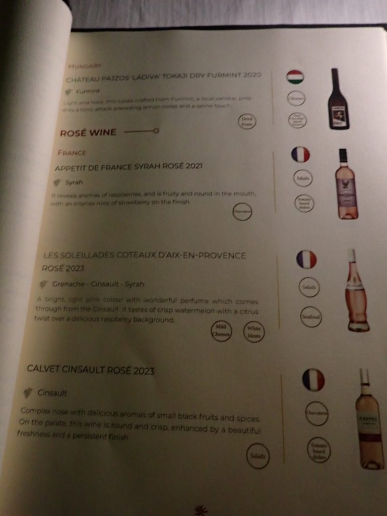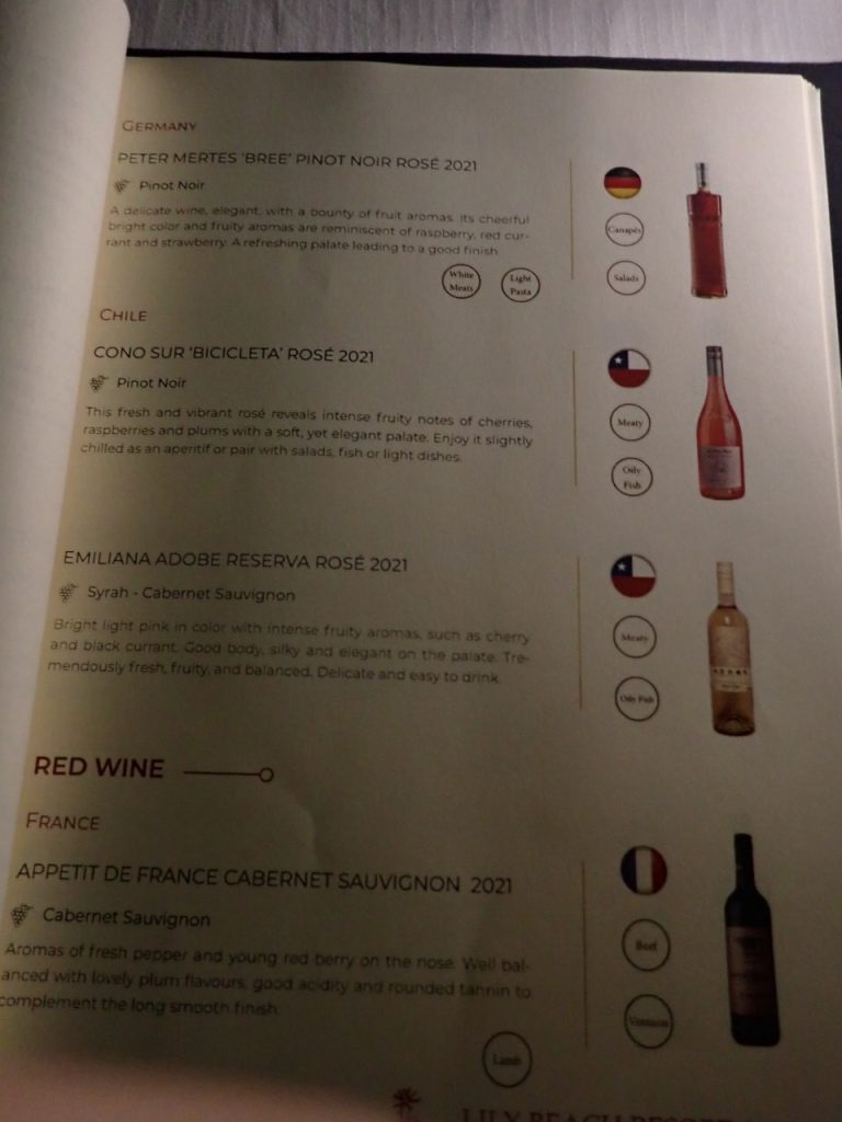 シャンパン、スパークリング、ノンアルコールスパークリング、白、ロゼ、赤、デザート、、その数なんと約7~80種類。もちろんオールインクルーシブに含まれています。