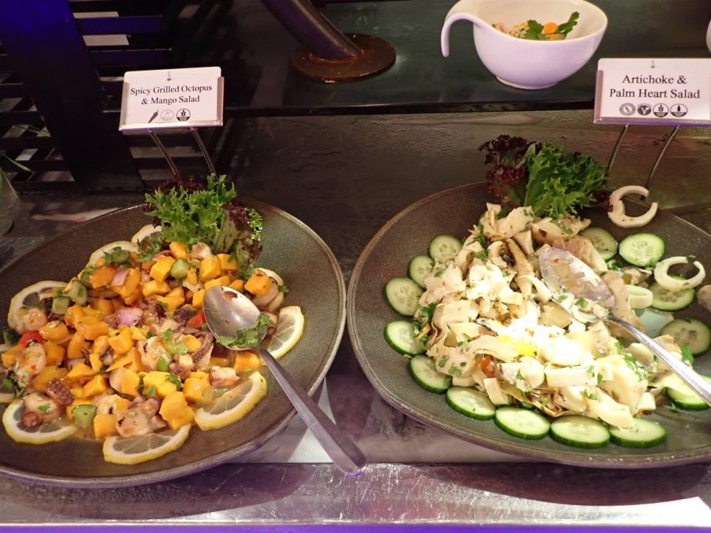 - スパイシー・グリル・オクトパスとマンゴーのサラダ、アーティーチョークとヤシの新芽のサラダ