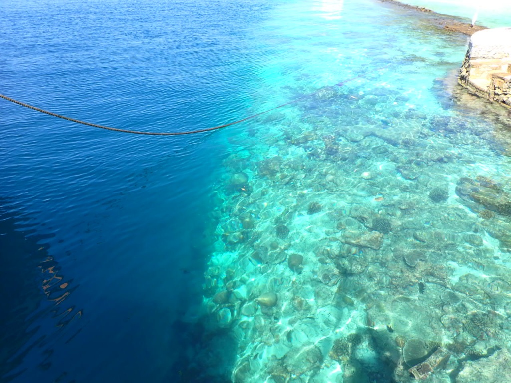 桟橋から海を覗きこんだら、透明度の高い海と珊瑚が見えます。
