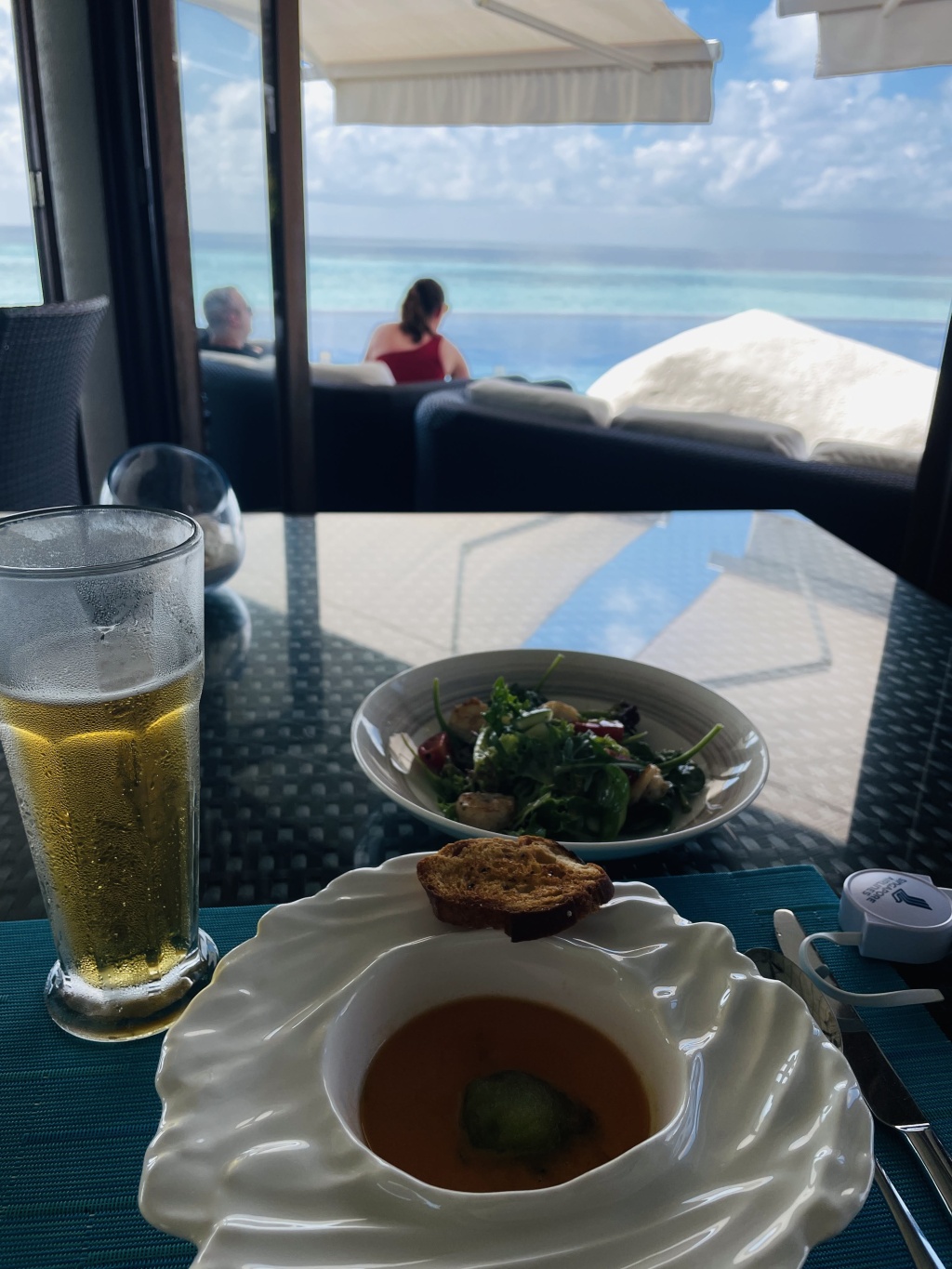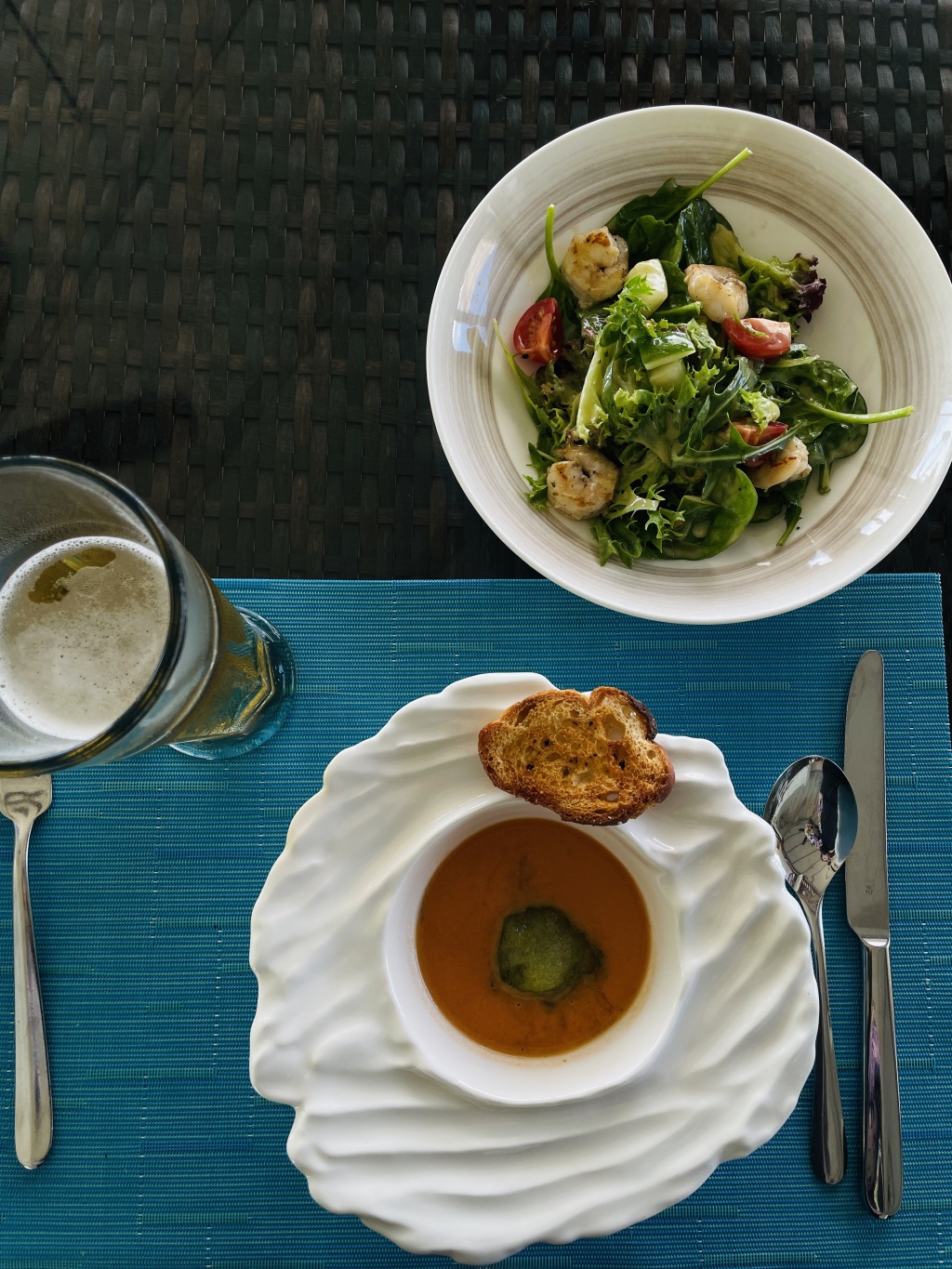 「ビール」と「ガスパッチョ」と「ホタテのグリーンサラダ」