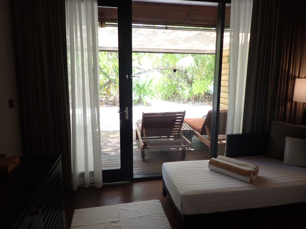 島の東南部にあるラグーン・ヴィラ(2棟1室)は、入口は島にあり、サンデッキは水上という「半水上タイプ」