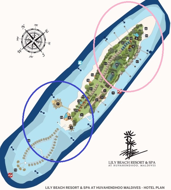 リリィ・ビーチの島は長く、メインレストラン「Lily Maa」を挟んで、東側が「ファミリーが過ごしやすいエリア(ピンク)」、西側が「大人やカップルが過ごしやすいエリア(ブルー)」と、なんとなく区分けされています。