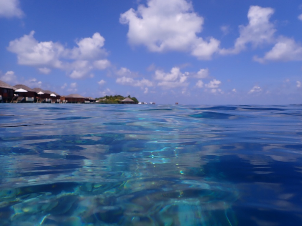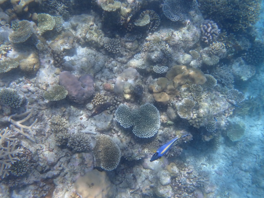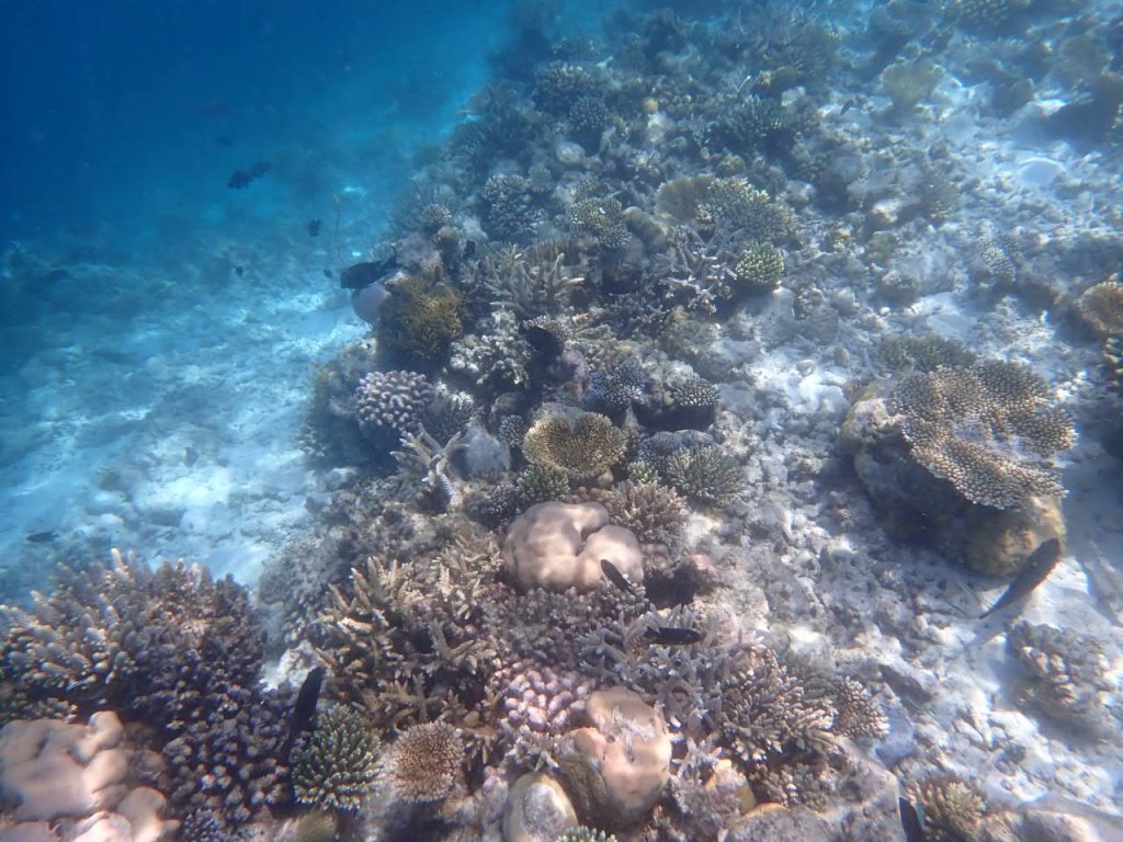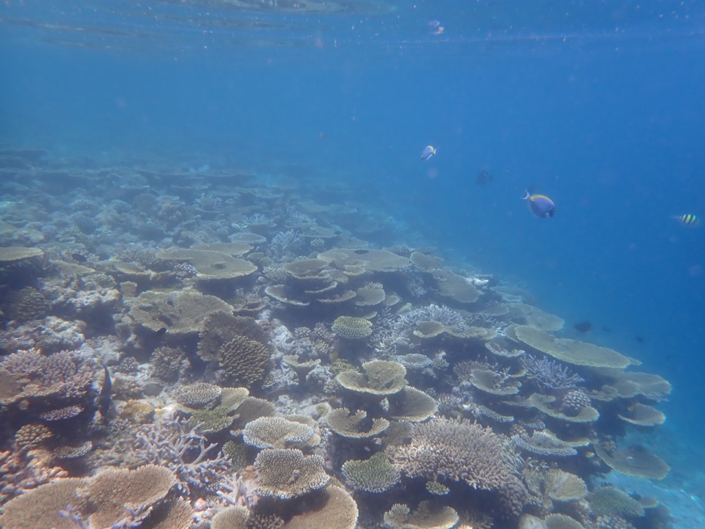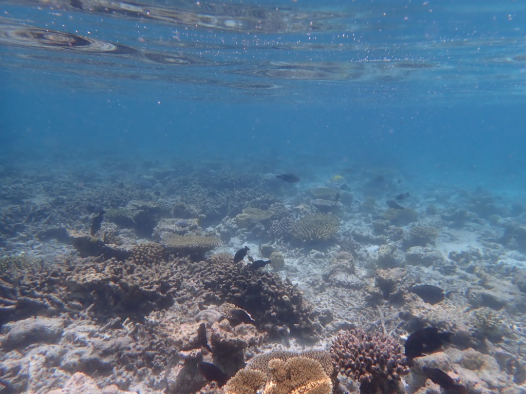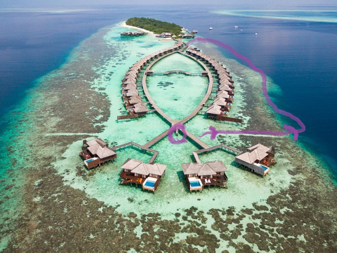 リゾートスタッフに「ハウスリーフでシュノーケルをするのに、ベストエリアはどこ?」と尋ねると、「島のどこも良いけど、南側のデラックス水上ヴィラ前エリアは、リーフエッジ(浅瀬から急激に水深を増すドロップオフとの境目)が近くて、珊瑚もぎっちりあるよ」と教えてもらいました。