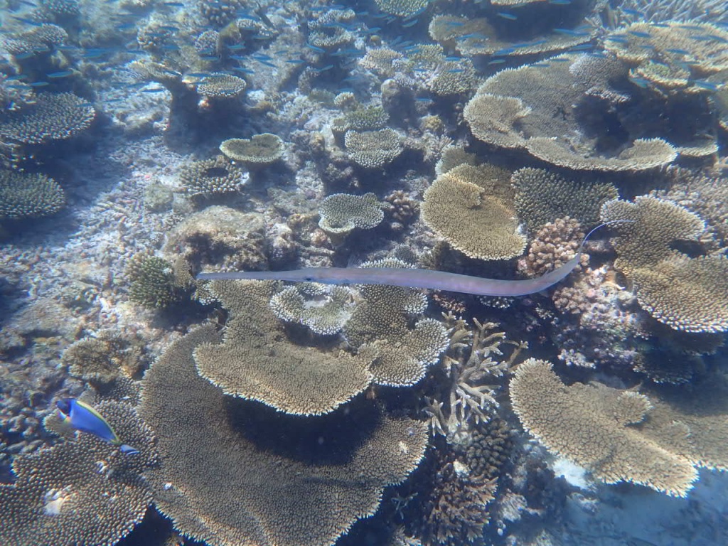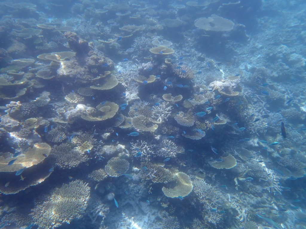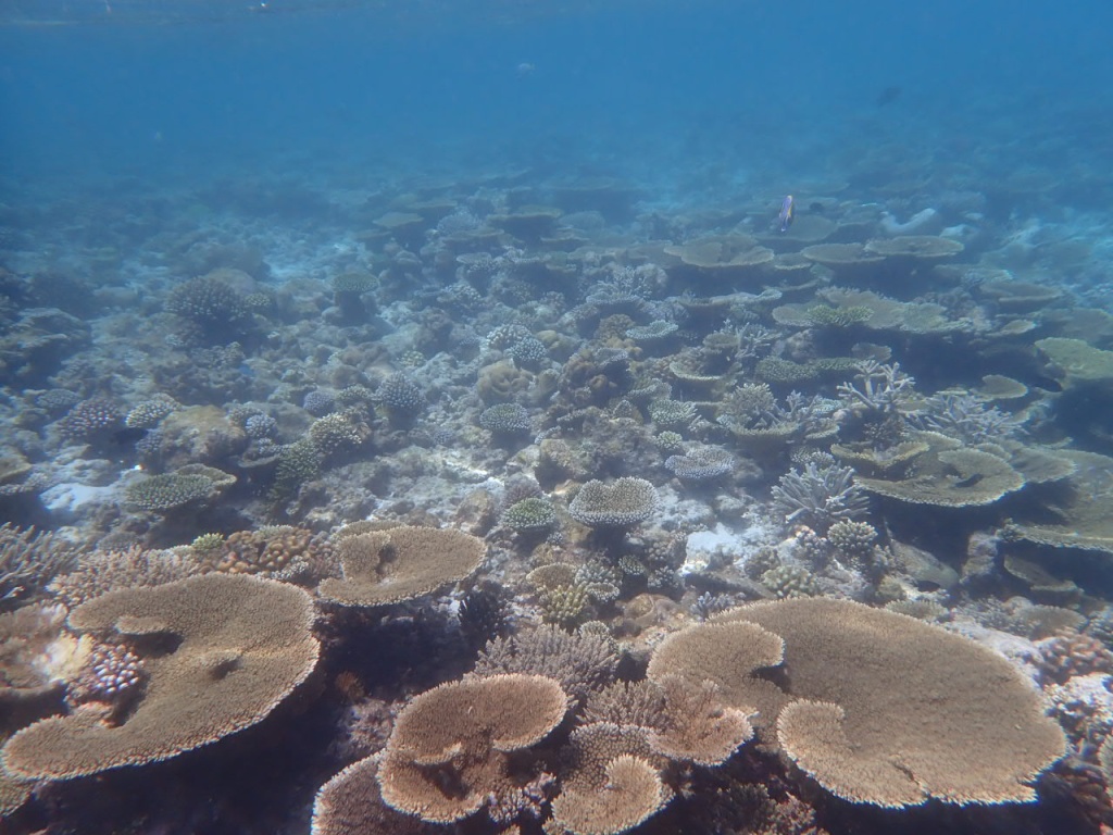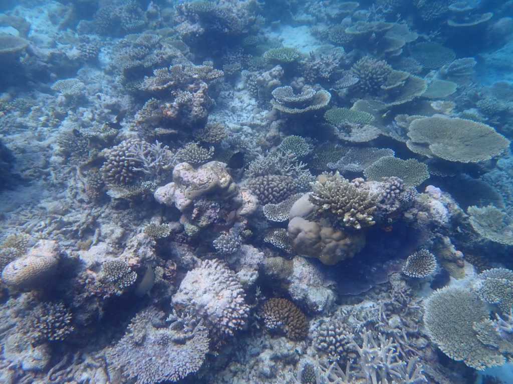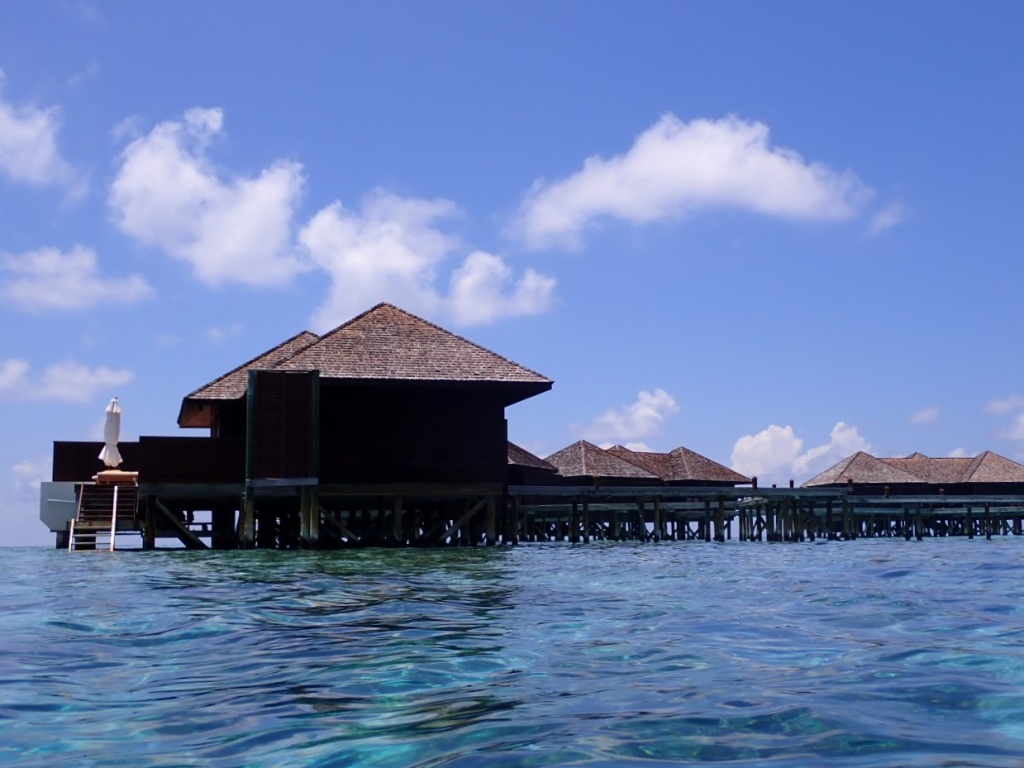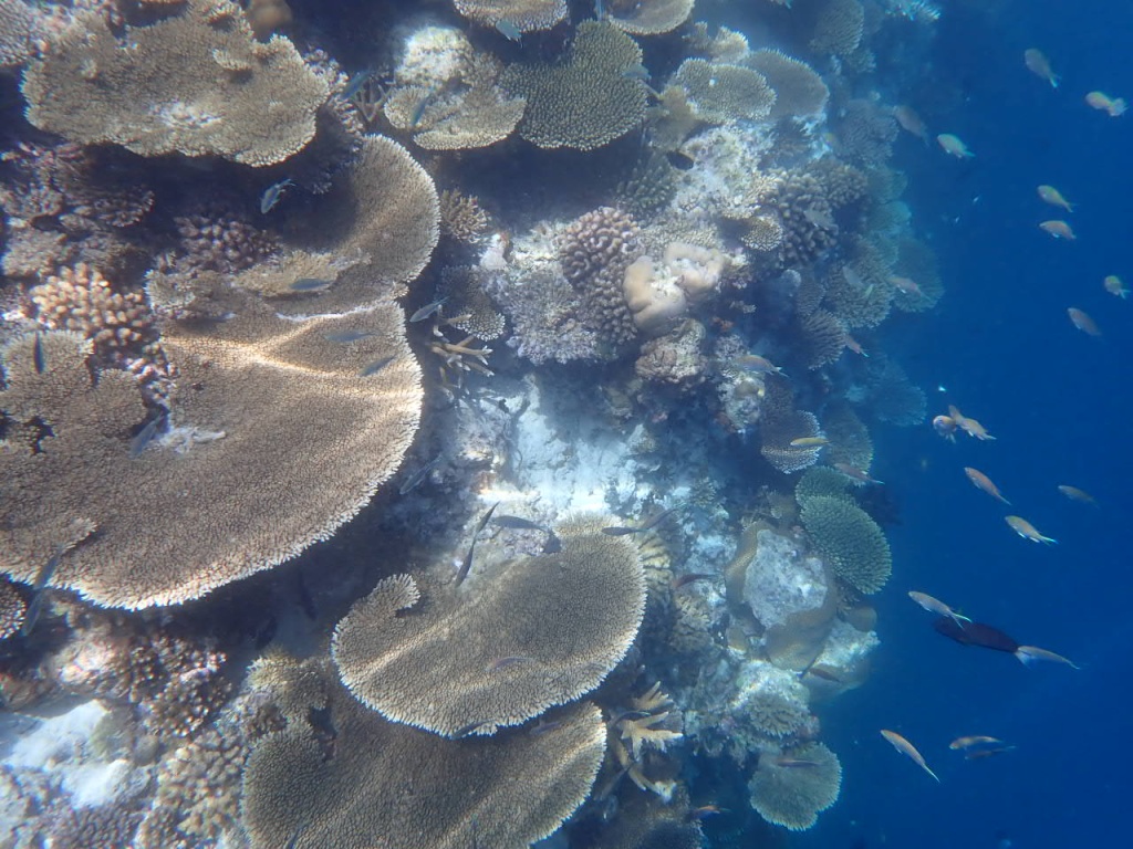 リゾートスタッフに「ハウスリーフでシュノーケルをするのに、ベストエリアはどこ?」と尋ねると、「島のどこも良いけど、南側のデラックス水上ヴィラ前エリアは、リーフエッジ(浅瀬から急激に水深を増すドロップオフとの境目)が近くて、珊瑚もぎっちりあるよ」と教えてもらいました。