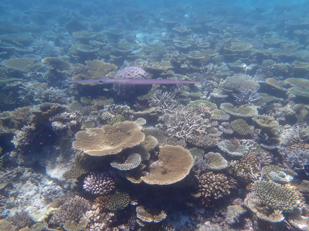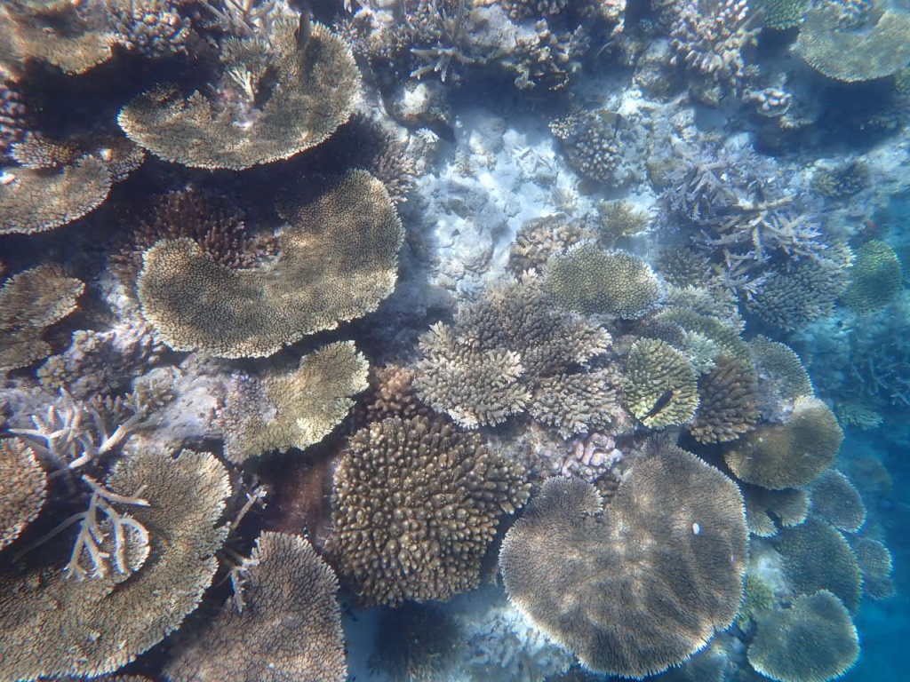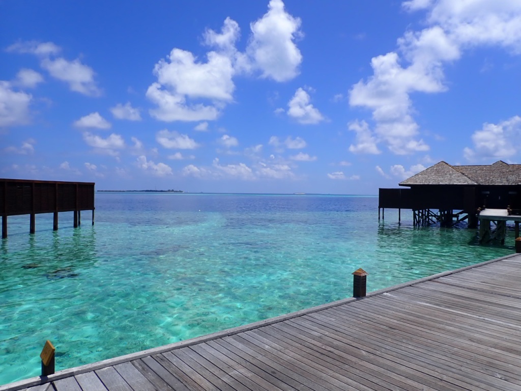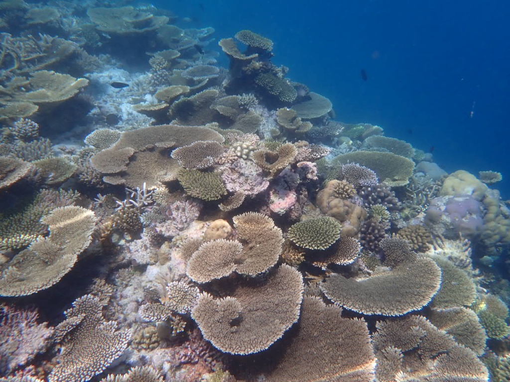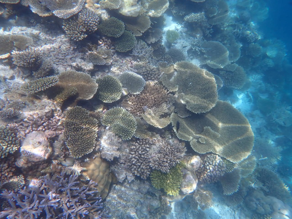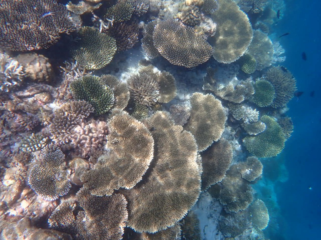 リゾートスタッフに「ハウスリーフでシュノーケルをするのに、ベストエリアはどこ?」と尋ねると、「島のどこも良いけど、南側のデラックス水上ヴィラ前エリアは、リーフエッジ(浅瀬から急激に水深を増すドロップオフとの境目)が近くて、珊瑚もぎっちりあるよ」と教えてもらいました。