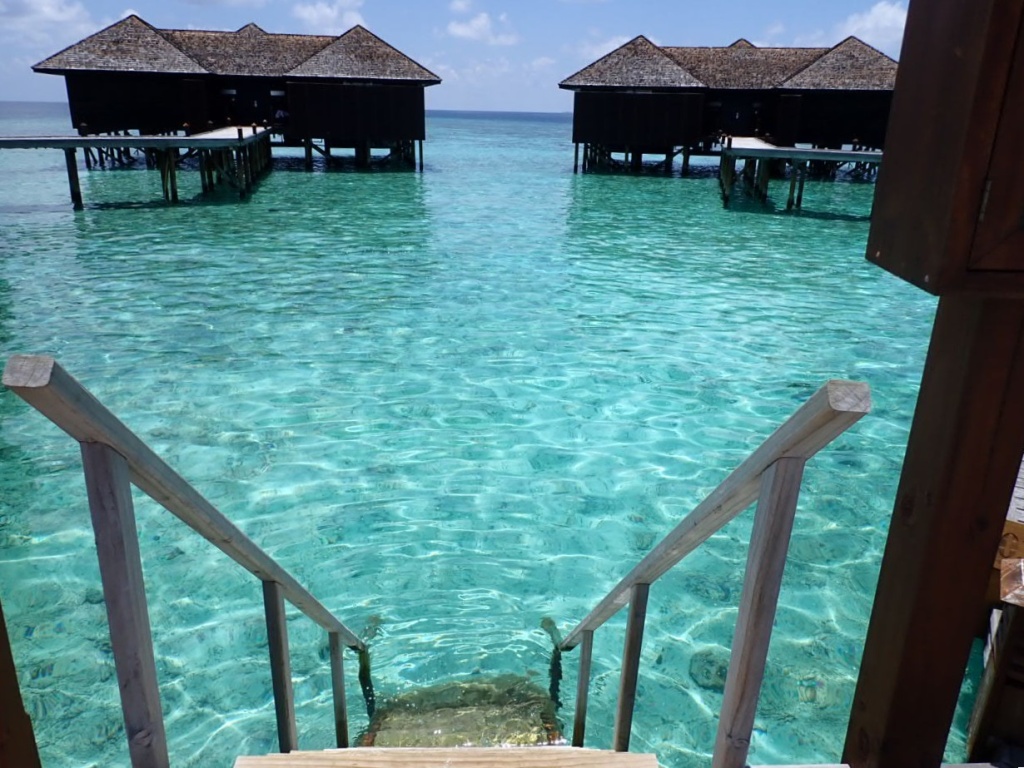 ただ、今回の私のデラックス水上ヴィラは北側(左側)なので、どうやって南側に行こうか。。と話していたら、「サンセット水上ヴィラ近くと島に近い桟橋の2ヶ所、海に降りる階段があるよ!」と。素晴らしい👏👏
