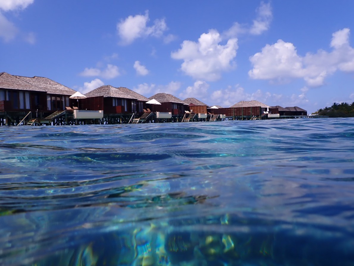 リゾートスタッフに「ハウスリーフでシュノーケルをするのに、ベストエリアはどこ?」と尋ねると、「島のどこも良いけど、南側のデラックス水上ヴィラ前エリアは、リーフエッジ(浅瀬から急激に水深を増すドロップオフとの境目)が近くて、珊瑚もぎっちりあるよ」と教えてもらいました。