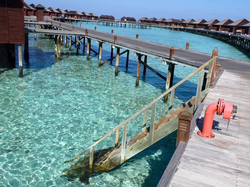 ただ、今回の私のデラックス水上ヴィラは北側(左側)なので、どうやって南側に行こうか。。と話していたら、「サンセット水上ヴィラ近くと島に近い桟橋の2ヶ所、海に降りる階段があるよ!」と。素晴らしい👏👏