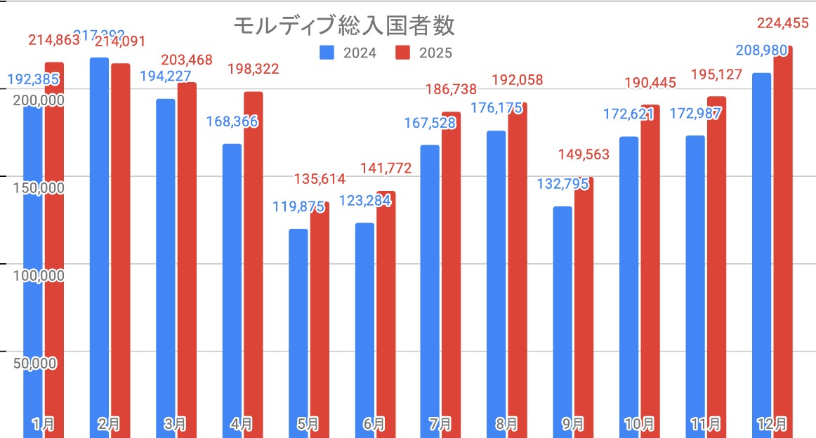 2025年のモルディブへの渡航者(入国者)数は、2,246,516名。2024年は2,046,615名だったので約10%増。