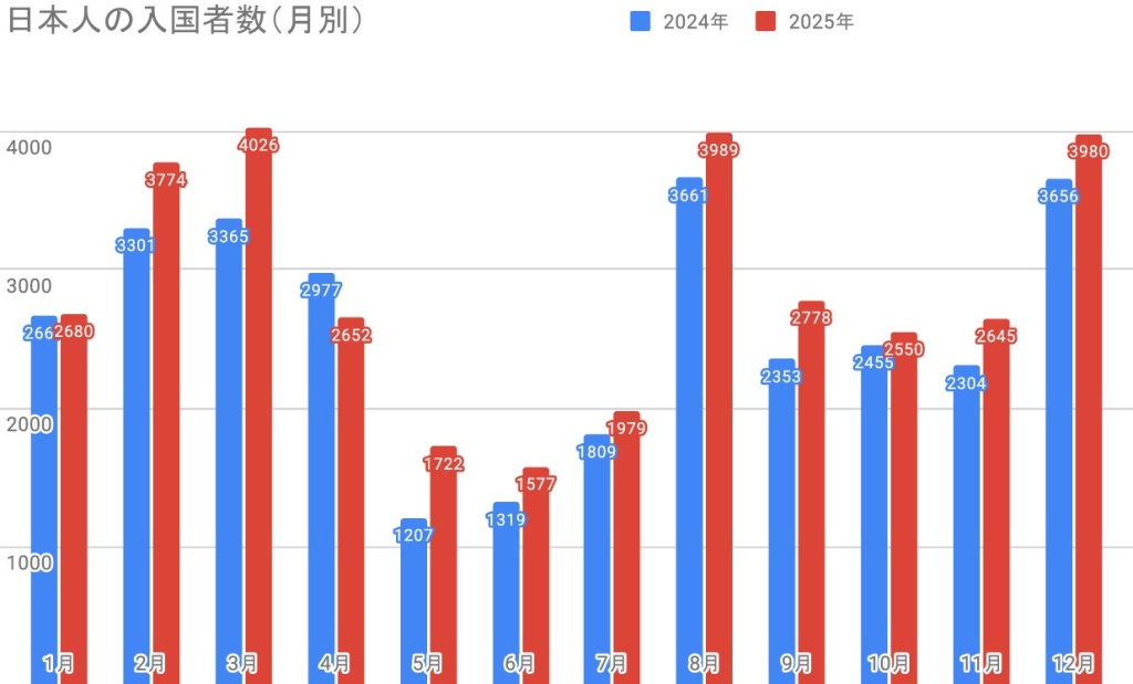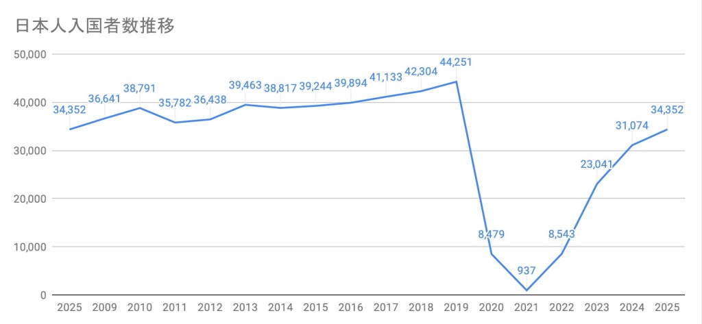 日本人入国者数推移(2009年-2025年)