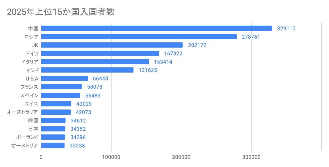 上位15ヶ国・入国者数(単位:名)