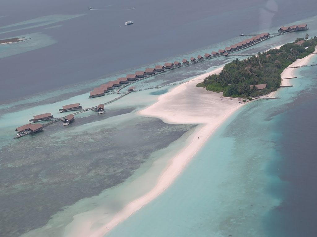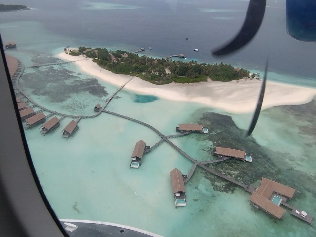 4泊したコモ・マーリフシ(タア環礁)からコモ・ココアアイランド(南マーレ環礁)への移動は、水上飛行機でのダイレクトトランスファー。マーリフシの桟橋でたくさんのスタッフに見送られた後、わずか70分後にはココアの桟橋で手厚い歓迎を受けているというスムーズさに感動しました。ココアの上空からはサンドバンクやリゾートの全景を眺めることができ、到着前からテンションUPでした。