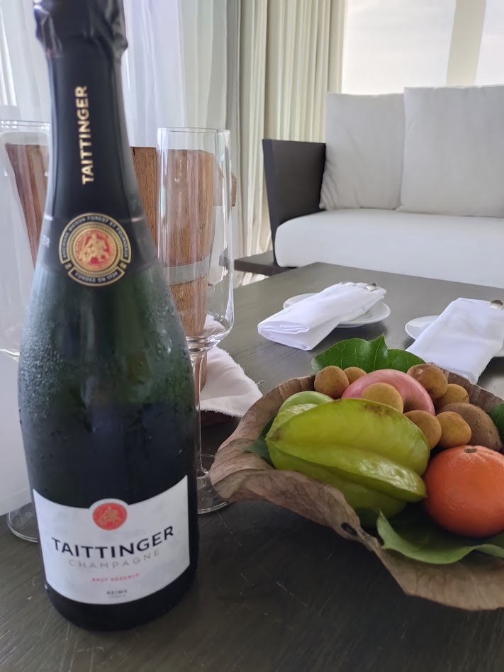 ・ウェルカムシャンパン(TAITTINGER)とウェルカムフルーツの小粒ブドウ