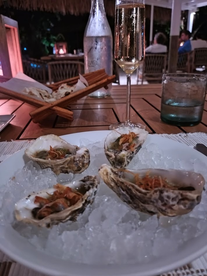 お部屋のウェルカムシャンパンをレストランに持ち込み、サーブして頂きました。おかげでソロながら素敵なディナータイムを楽しめました。カキは最高でした。