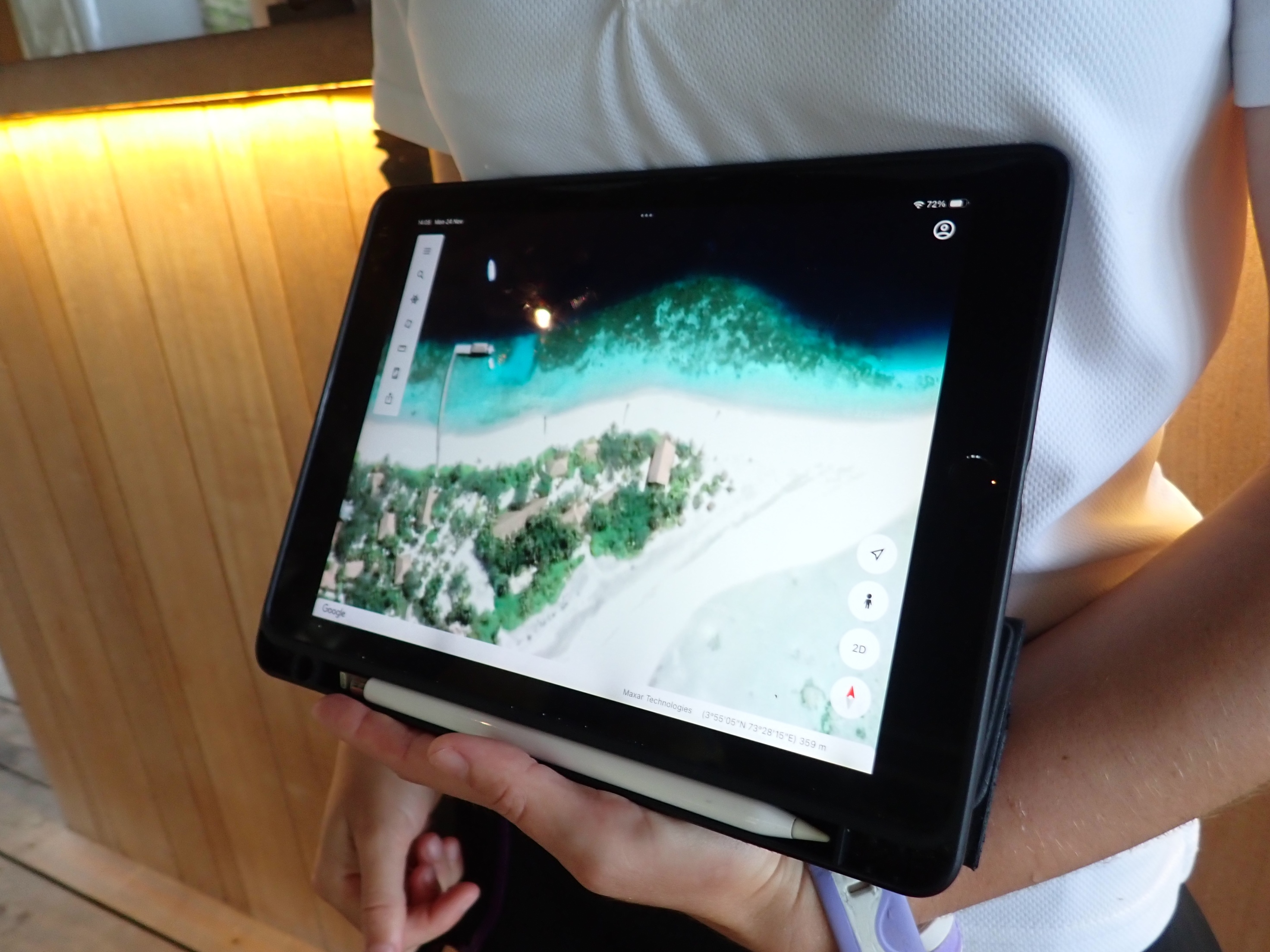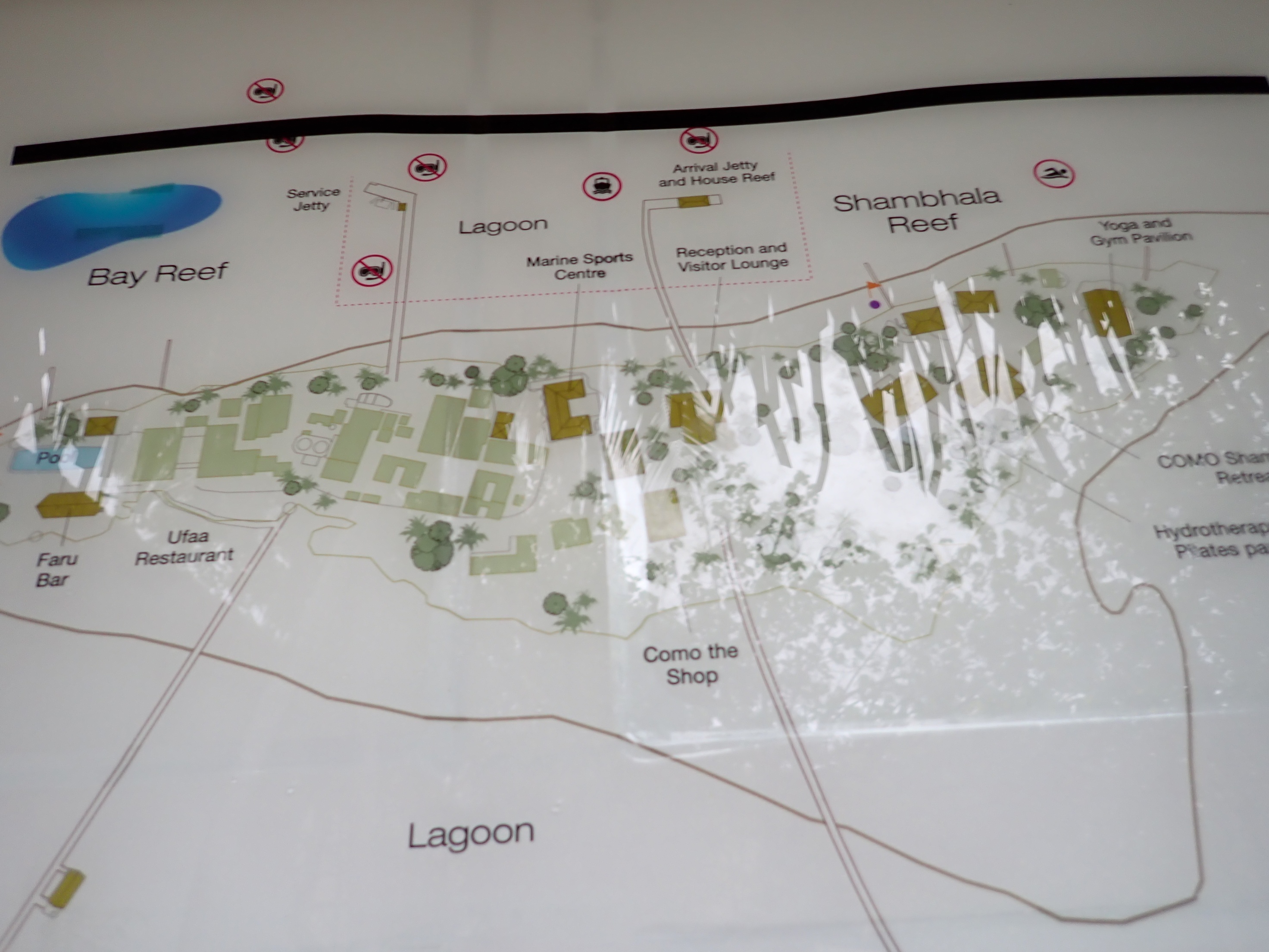 到着した桟橋では、リゾートマネージャーを筆頭に大勢の歓迎を受けて握手の嵐。バトラーを紹介されて、レセプションでココナッツウォーターをいただいた後、リゾートを案内して貰いながら徒歩でお部屋へ。ココアはカートや自転車がないのには驚きました。