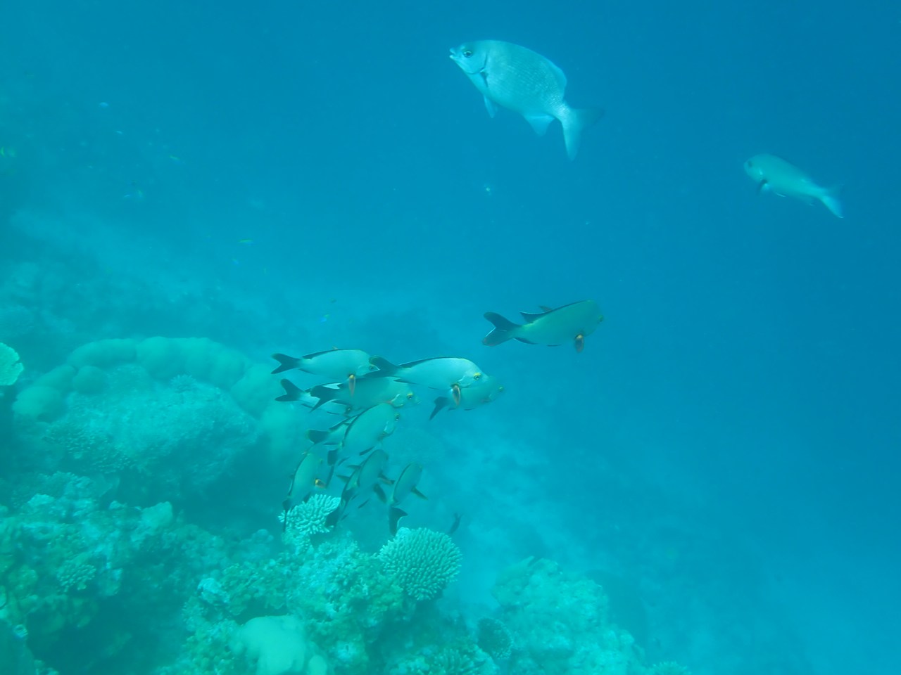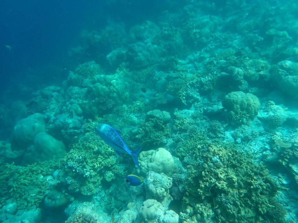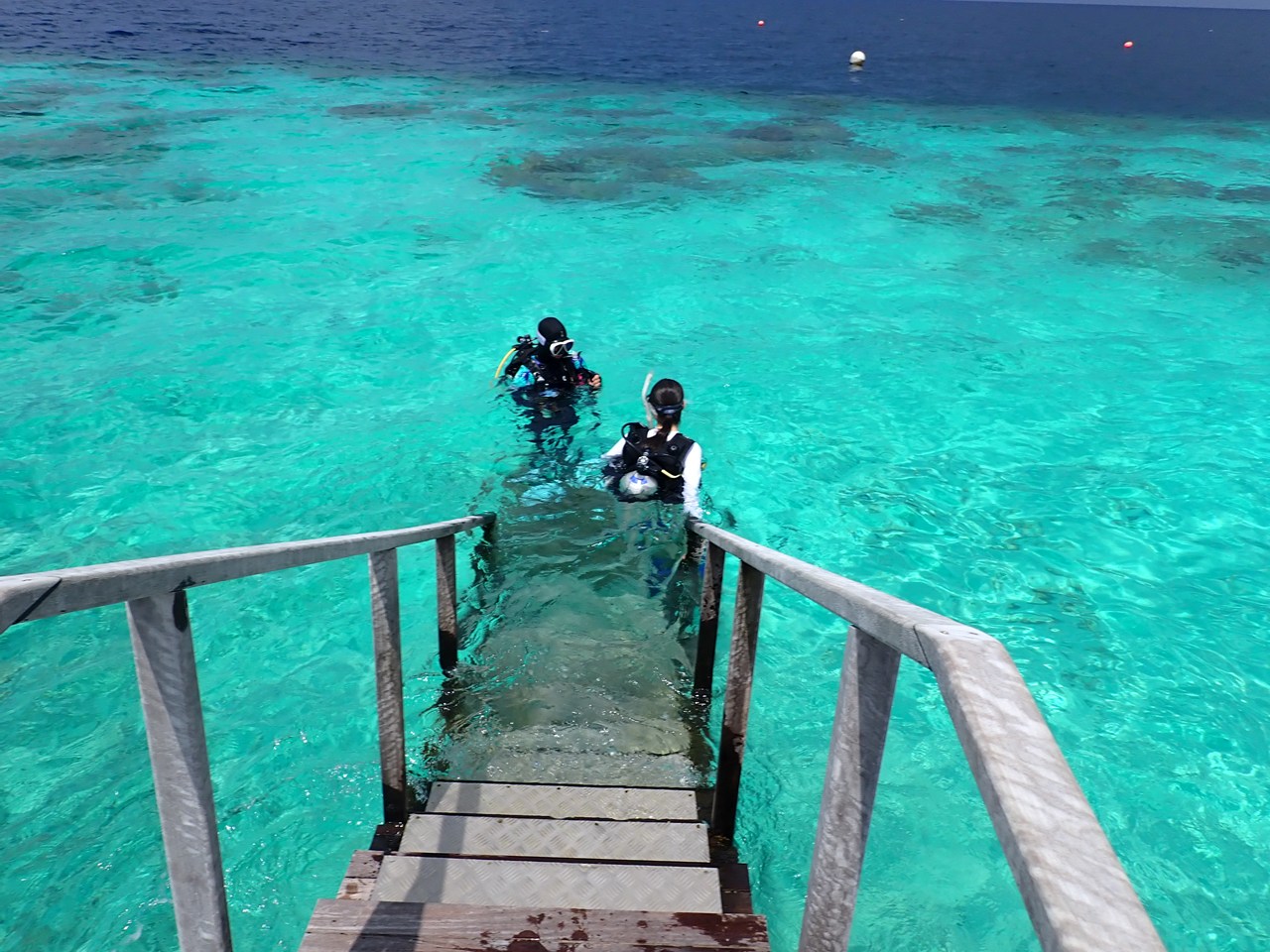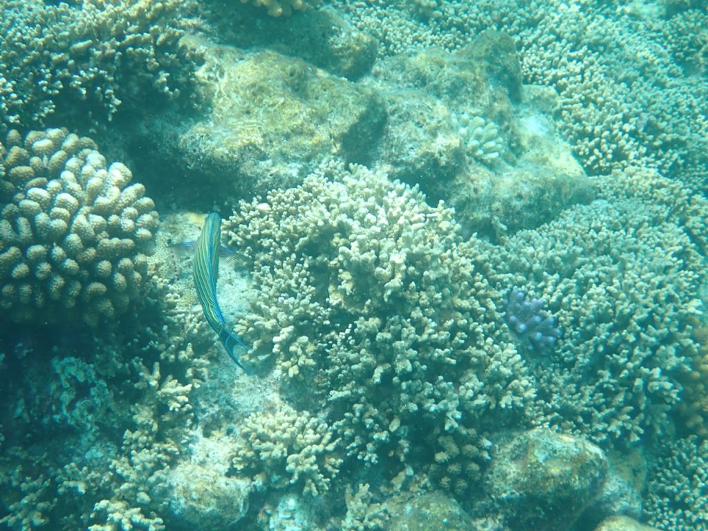 主人と二人だったら探検気分で積極的なシュノーケルをしたでしょうが、今回はソロステイだったので情報のないままいきなり一人では飛び込めず、ガイドシュノーケルにまずは参加しました。リゾートでは何か所かハウスリーフを楽しめるようですが、ベストなポイントはメインジェッティの先にさらにドロップオフまで伸びる専用桟橋からINし左右に流すコース。立派なアプローチが設けられていてスタッフも常駐。