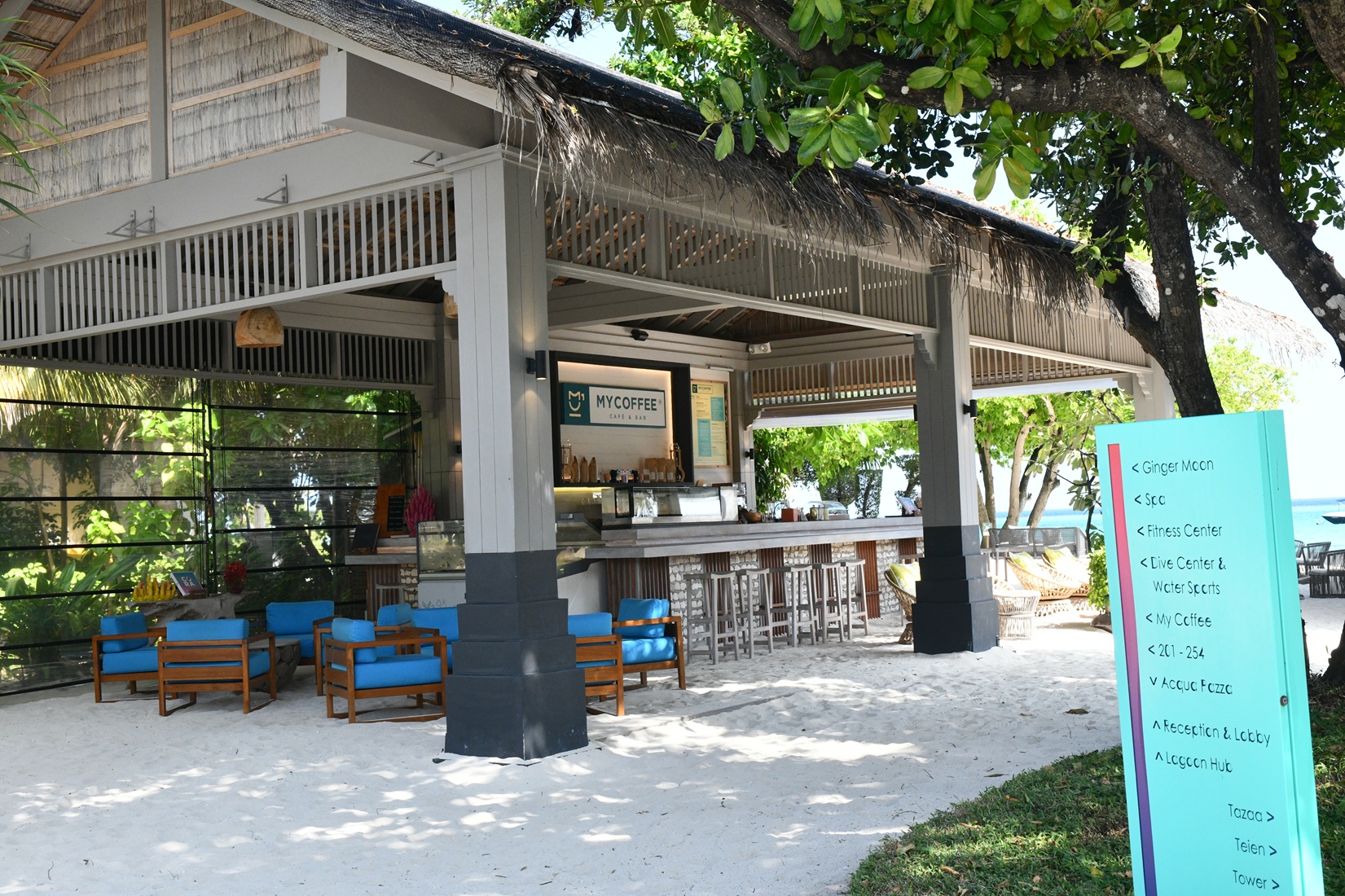 インテリアや水上ヴィラの壁の絵や、ポップな色使いの明るい印象で、ファミリー、ハネムーナーとたくさんのゲストが訪れている人気のリゾートだなあと思いました。