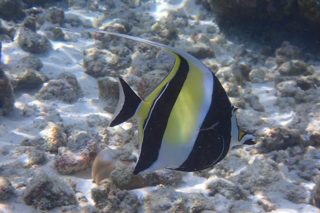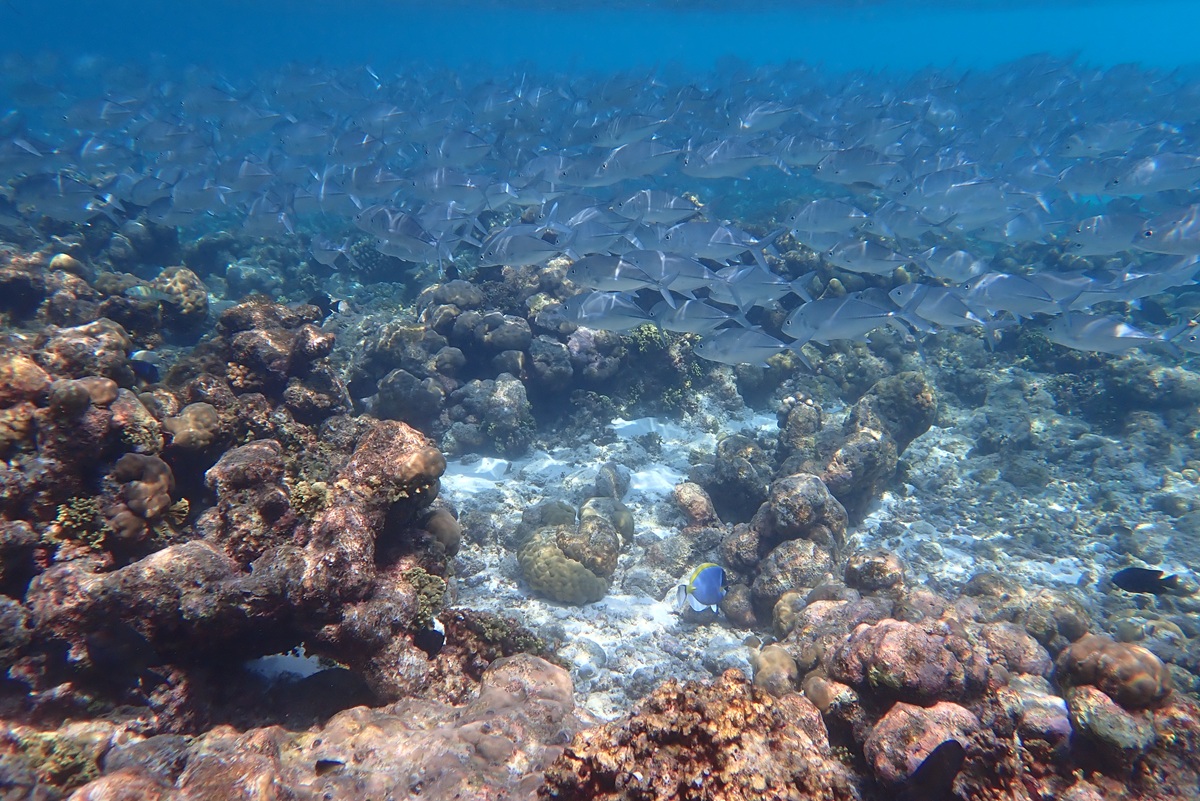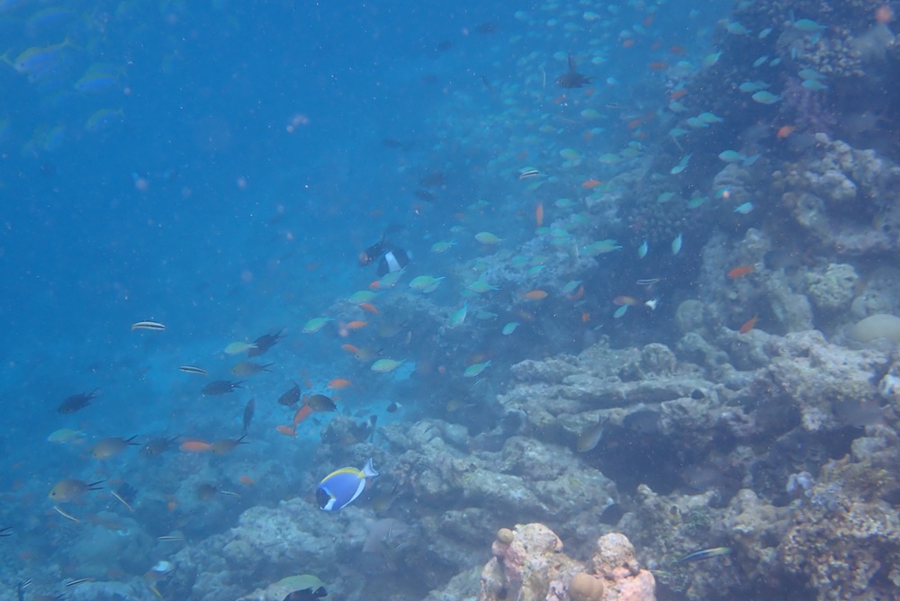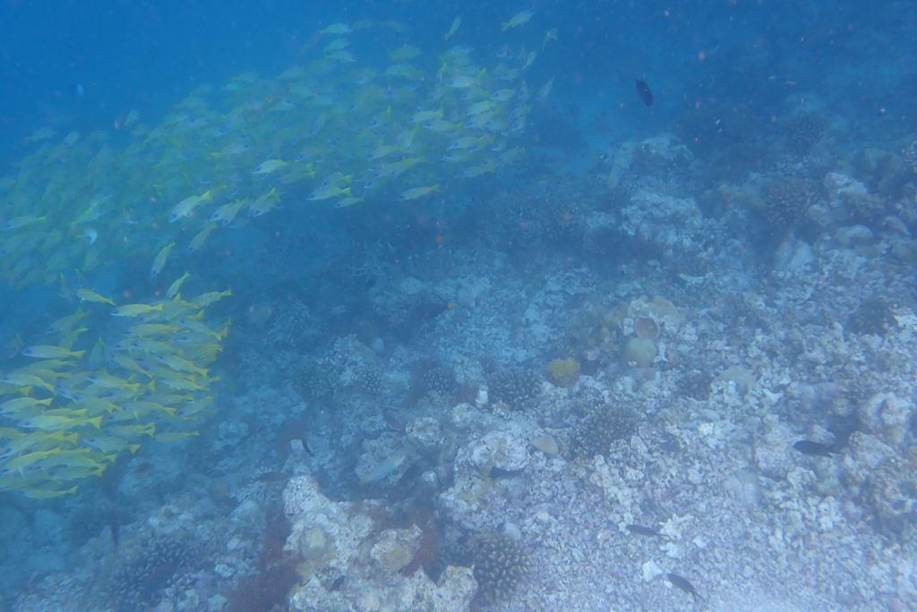 モルディブお馴染みの魚たち、メインレストランを過ぎた先(南側)にはギンガメアジの大群、波打ち際にはお馴染みのこいわし軍団も見れ、楽しかったです。