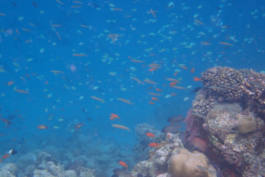 顔がチクチクするくらいプランクトンが多く、透明度はあまりよくなかったのですが、思わず声をあげたくなるほどの魚影の濃さに興奮しました。今までのスノーケリングの中で、1,2位を争うくらい素晴らしかったです。
