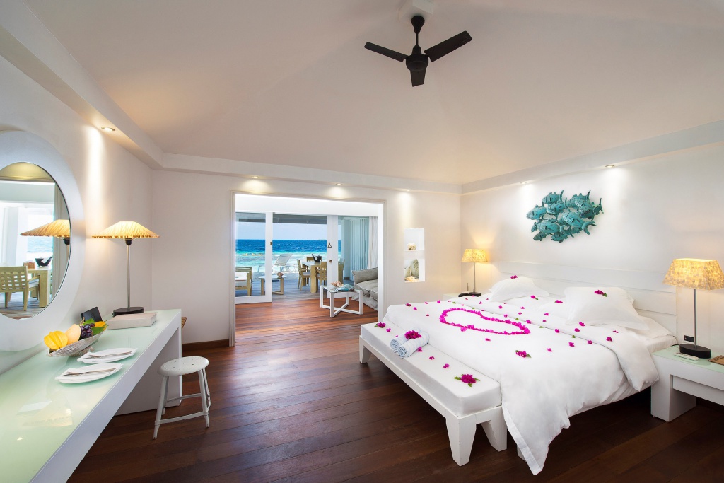 * 屋根まで真っ白な水上ヴィラはモルディブでも珍しく、ターコイスブルーの海と水上ヴィラとのコントラストがとても美しい