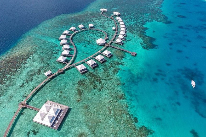 真っ白な水上ヴィラのサンデッキでくつろぎ、ハウスリーフでスノーケリング三昧のオールインクルーシブリゾート