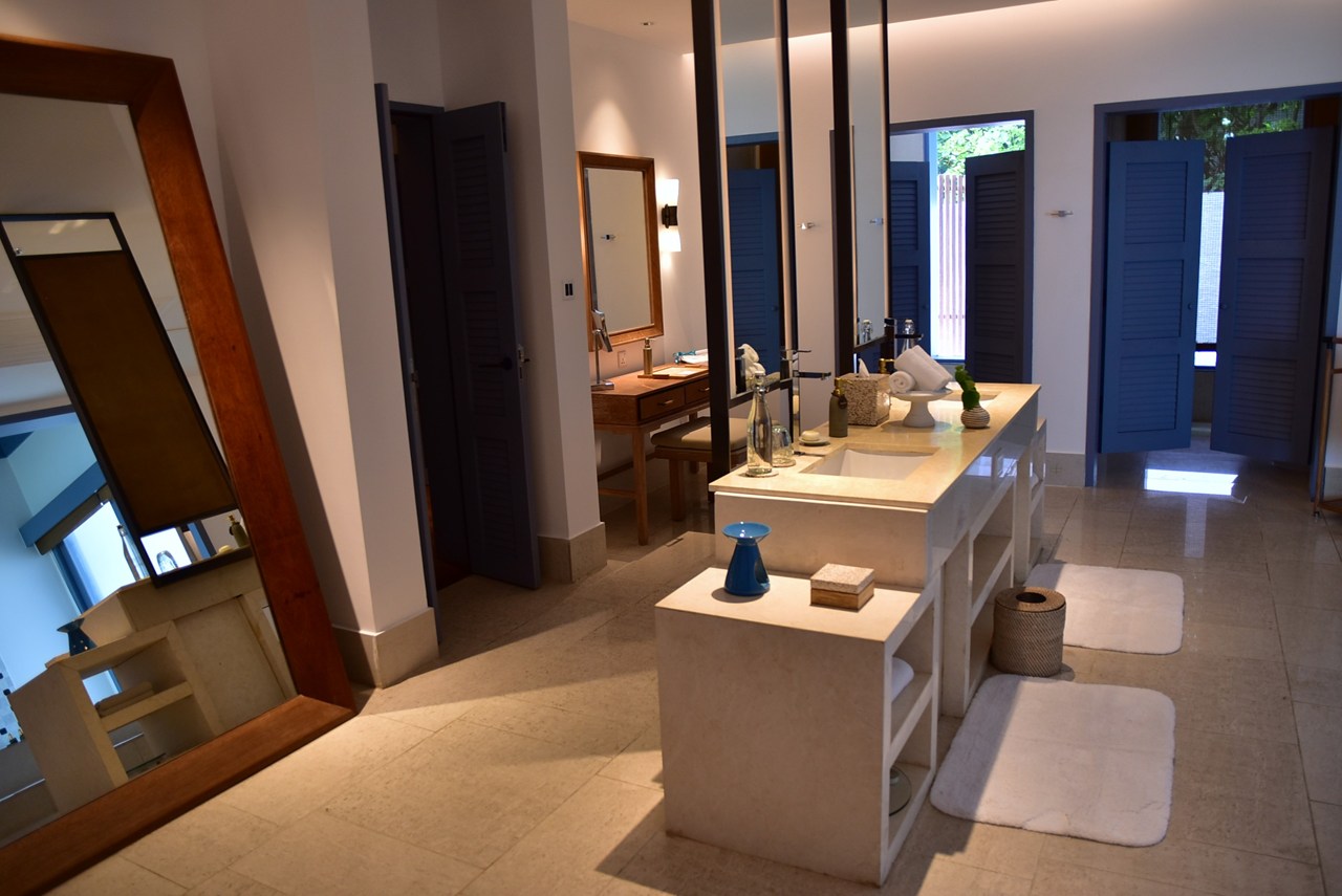 今回私たちが滞在したお部屋はエントリーレベル(1番安い部屋タイプ)のプール付きビーチヴィラです。とは言え、部屋の広さは220㎡もあり、メインルームにはベッドだけでなく、ゆったりと寛げるソファセットとデスクがあるリビングスペースも備わっています。ジュメイラ・デヴァナフシの時はダークブラウンを基調とした重厚感のあるお部屋でしたが、ラッフルズになってからは、天井や扉の色にライトブルーを取り入れ、コロニアル調が増した明るく優しい雰囲気のお部屋に変わりました。