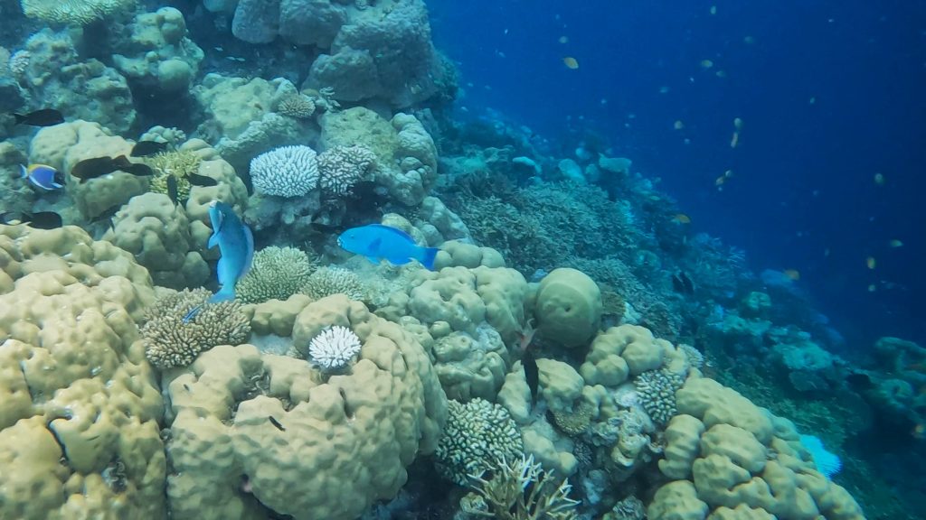 東側のビーチヴィラに滞在している場合は、一番アクセスのしやすいハウスリーフで、ダイビングセンター前のビーチからエントリーし、スパの建物の横にパッセージが造られているので、そこからハウスリーフ&ドロップオフに出られます。この辺りのハウスリーフは比較的浅瀬にあるので、2016年にかなりダメージを受けた場所でもありましたが、多くの珊瑚が復活途中にありとても驚きました。