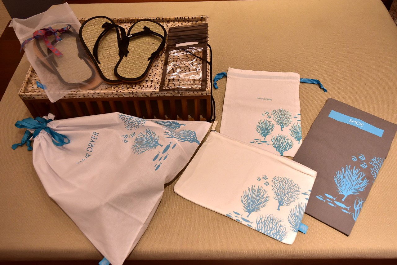 クローゼットに置かれていたアメニティー類を集めてみました。ビーチサンダルは日本の草履のような素材でリボンが掛けられた袋に入っており、その横の透明なビニール製の袋はスマホケース。珊瑚と魚の絵が描かれたコットン生地の袋は、ドライヤー入れ、ランジェリー入れ、シューズ入れ、そして小物が入れられるポーチで、どれをとっても心くすぐられる可愛らしさです。