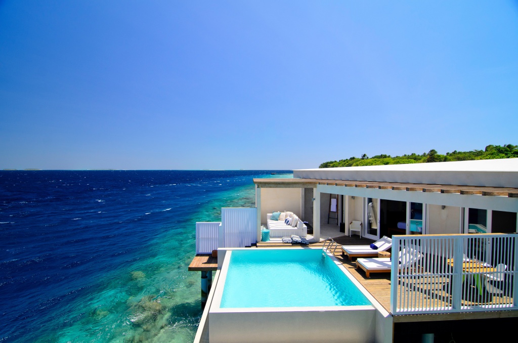 * 家のようなスタイリッシュモダンな広いヴィラ、リーフ・ウォーターヴィラ前には魚影の濃いドロップオフが広がる