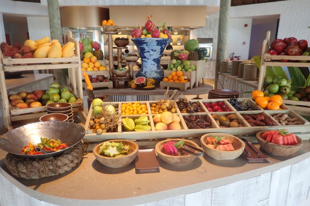 * 島で採れたオーガニック野菜や多彩な料理が並ぶ朝食ビュッフェ、ディナーも日替わりのテーマビュッフェ