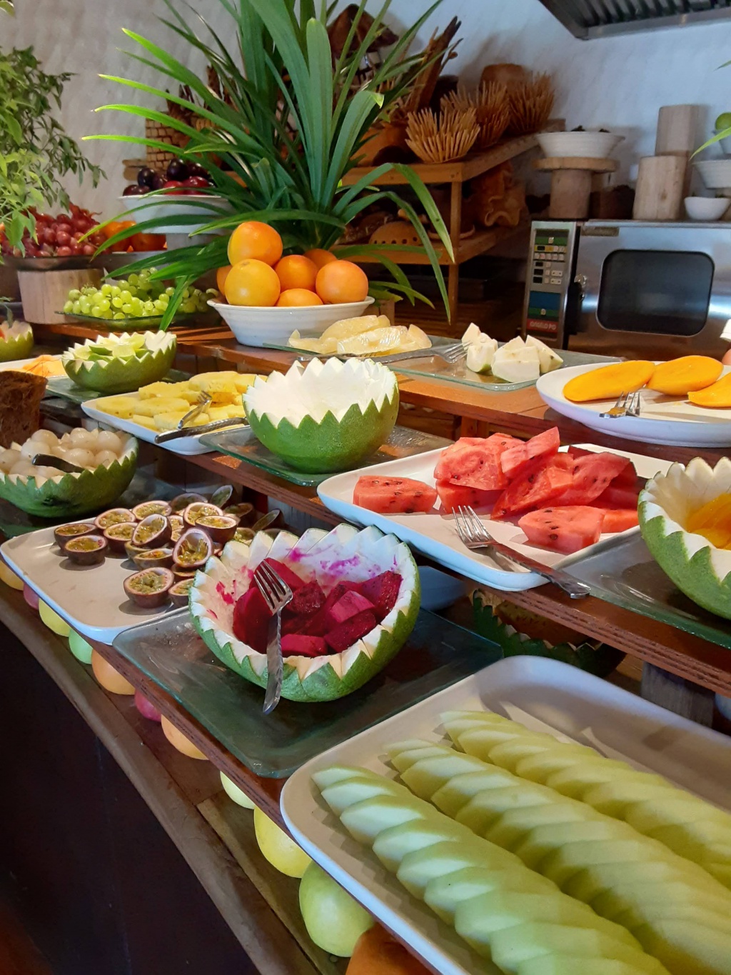 私は椰子の木の下が好きですが、ビーチ際にもテーブルがあるので、海を眺めながらの朝食もOK!