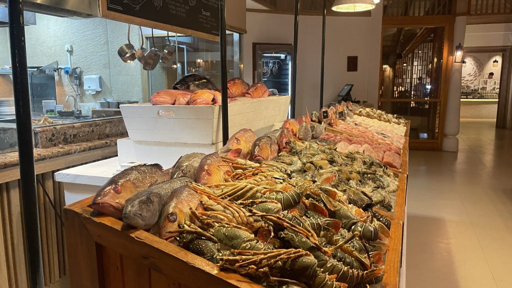 ロブスターなどの新鮮なシーフードが並ぶ、シーフードマーケット