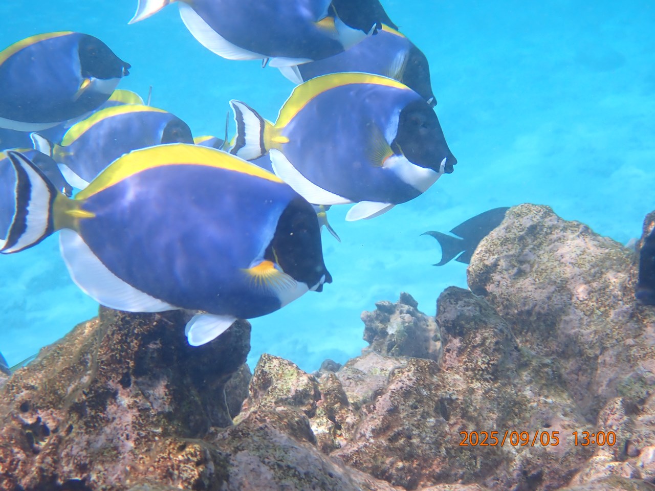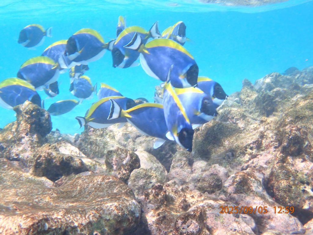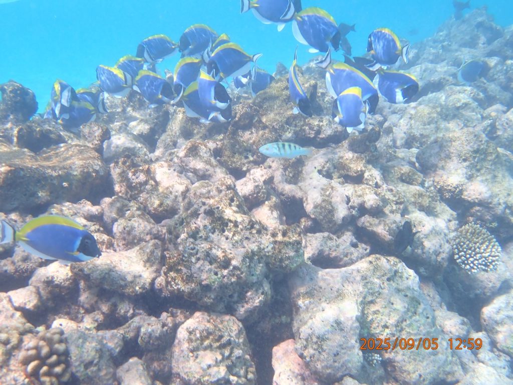ヴィラからのシュノーケルでは、防波堤で見かけると噂のパウダーブルーの群に会えて感動しました。