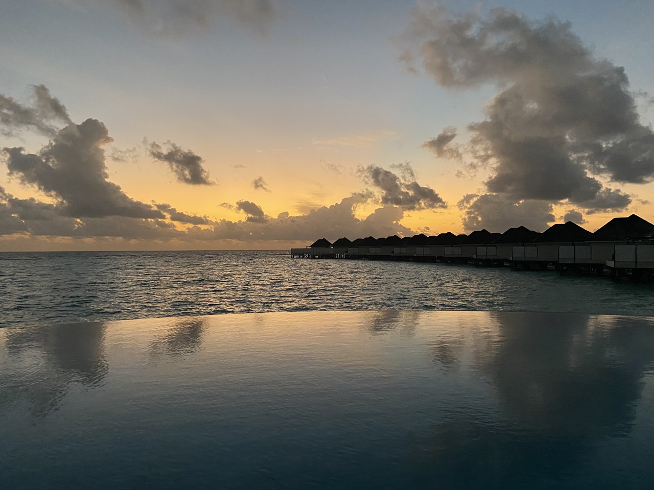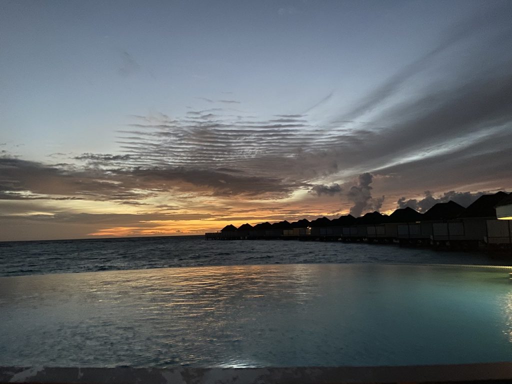 メインプールから眺めるサンセットと水上ヴィラのシルエット