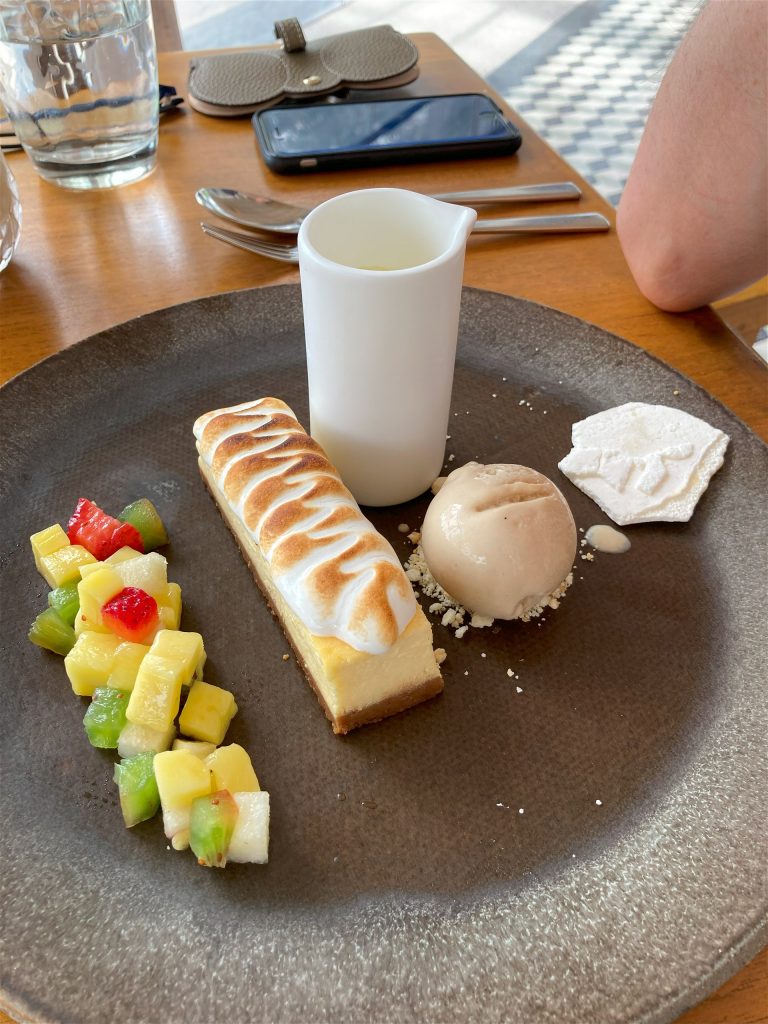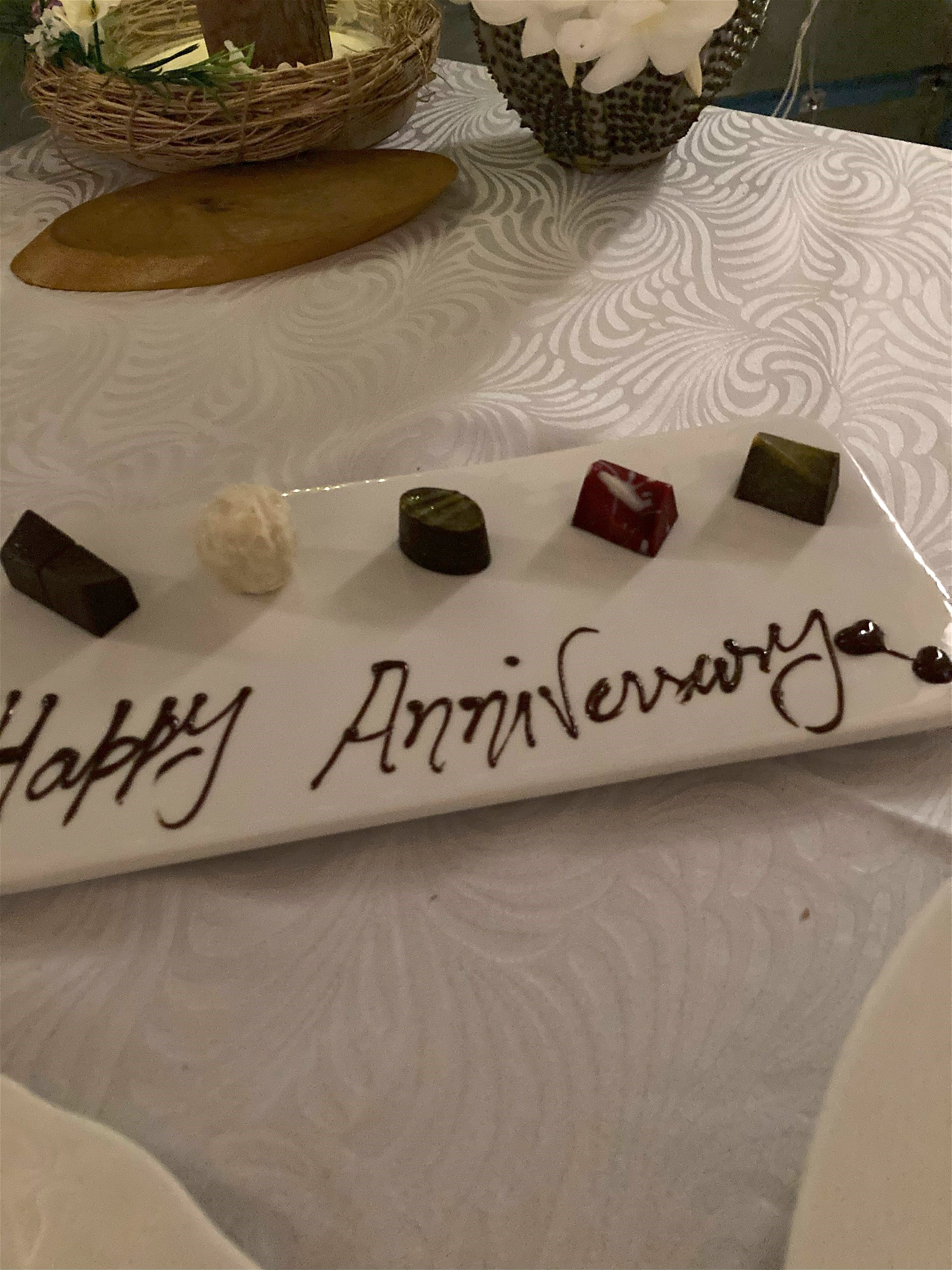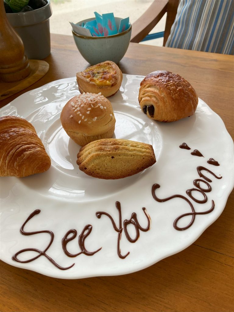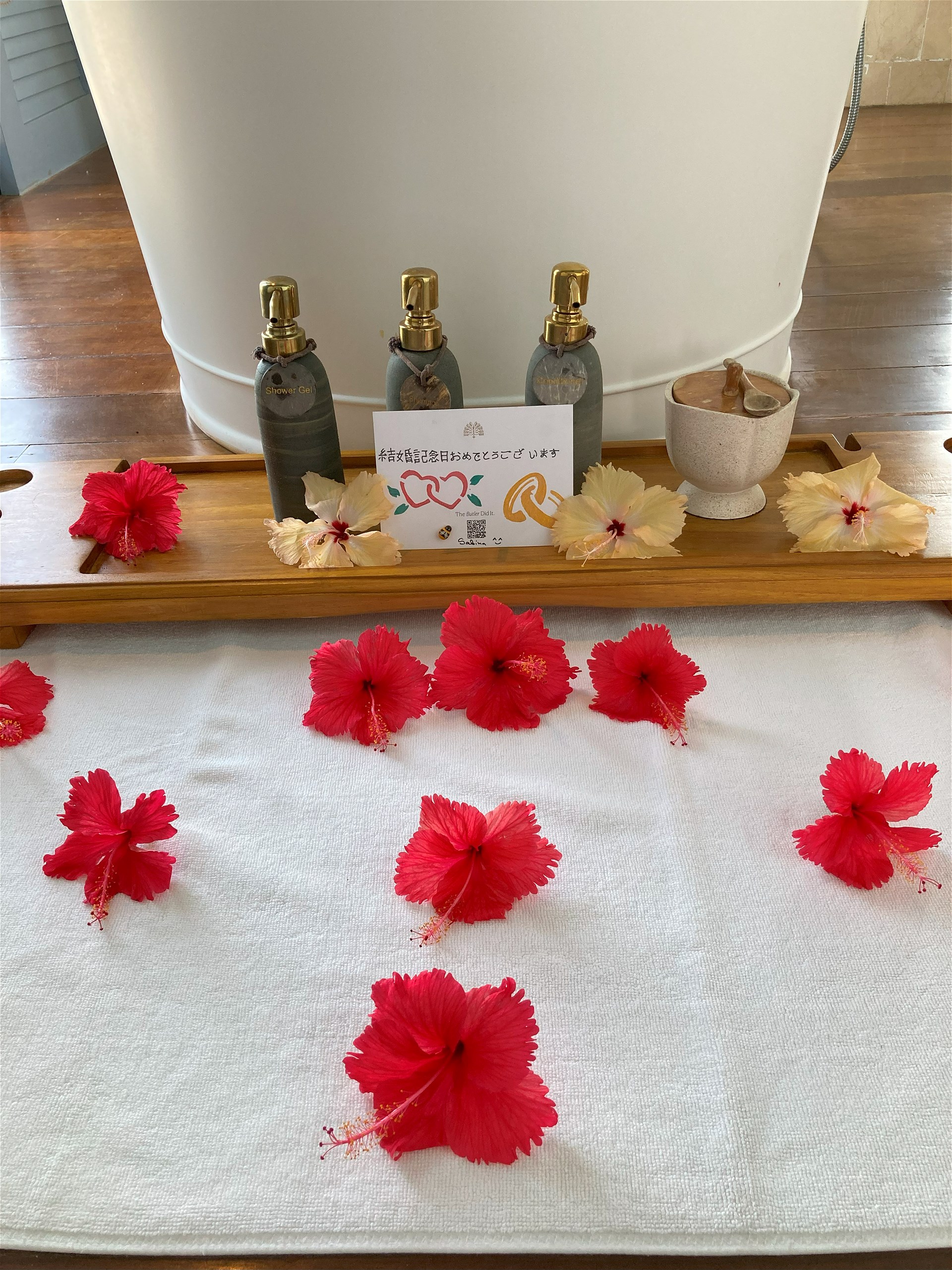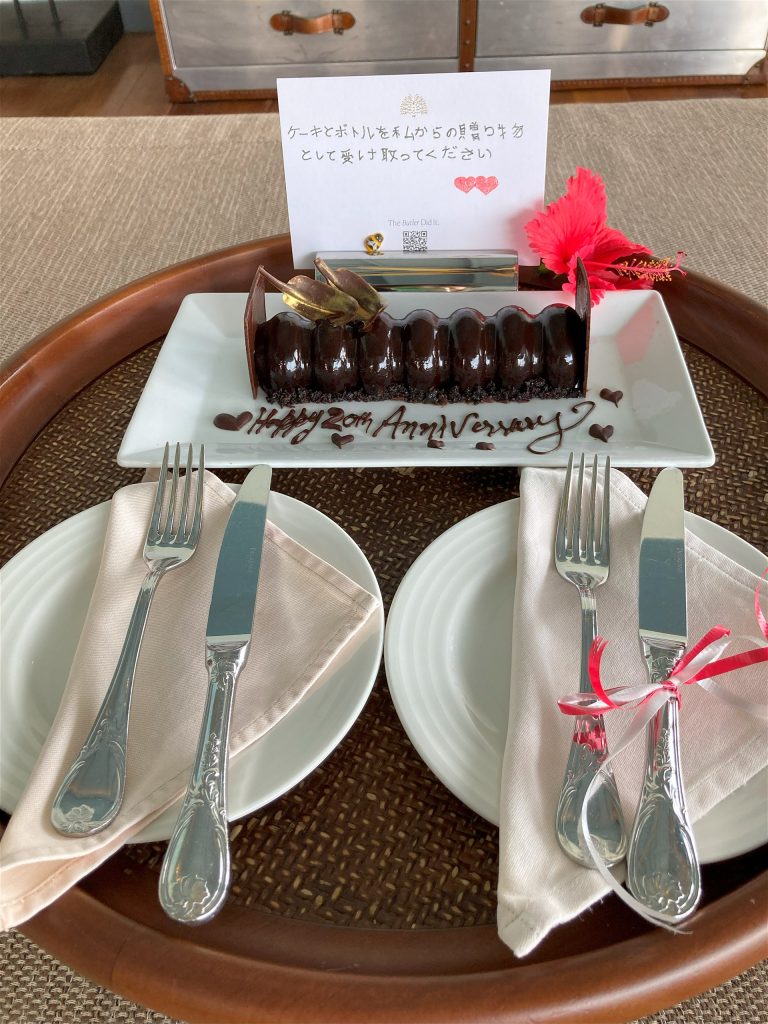 ラッフルズではバトラーがつき、色んなことをバトラーさんにWhatsAppを通じてお願いしたり、翌日オープンしているレストランを教えてもらったりしました。WhatsAppでの会話は日本語でOKと言われたので、バトラーさんの方で翻訳してくれていました。記念日旅行ということで、水上ヴィラに移動した日に、ケーキ等でお祝いしてくれて嬉しかったです。