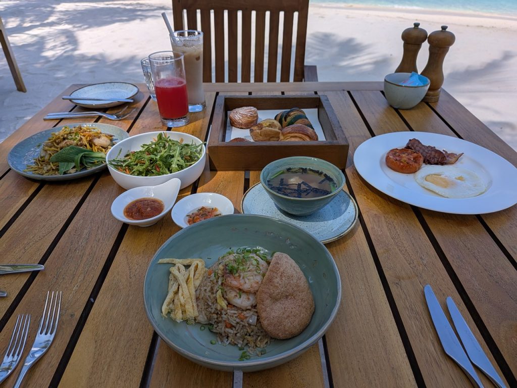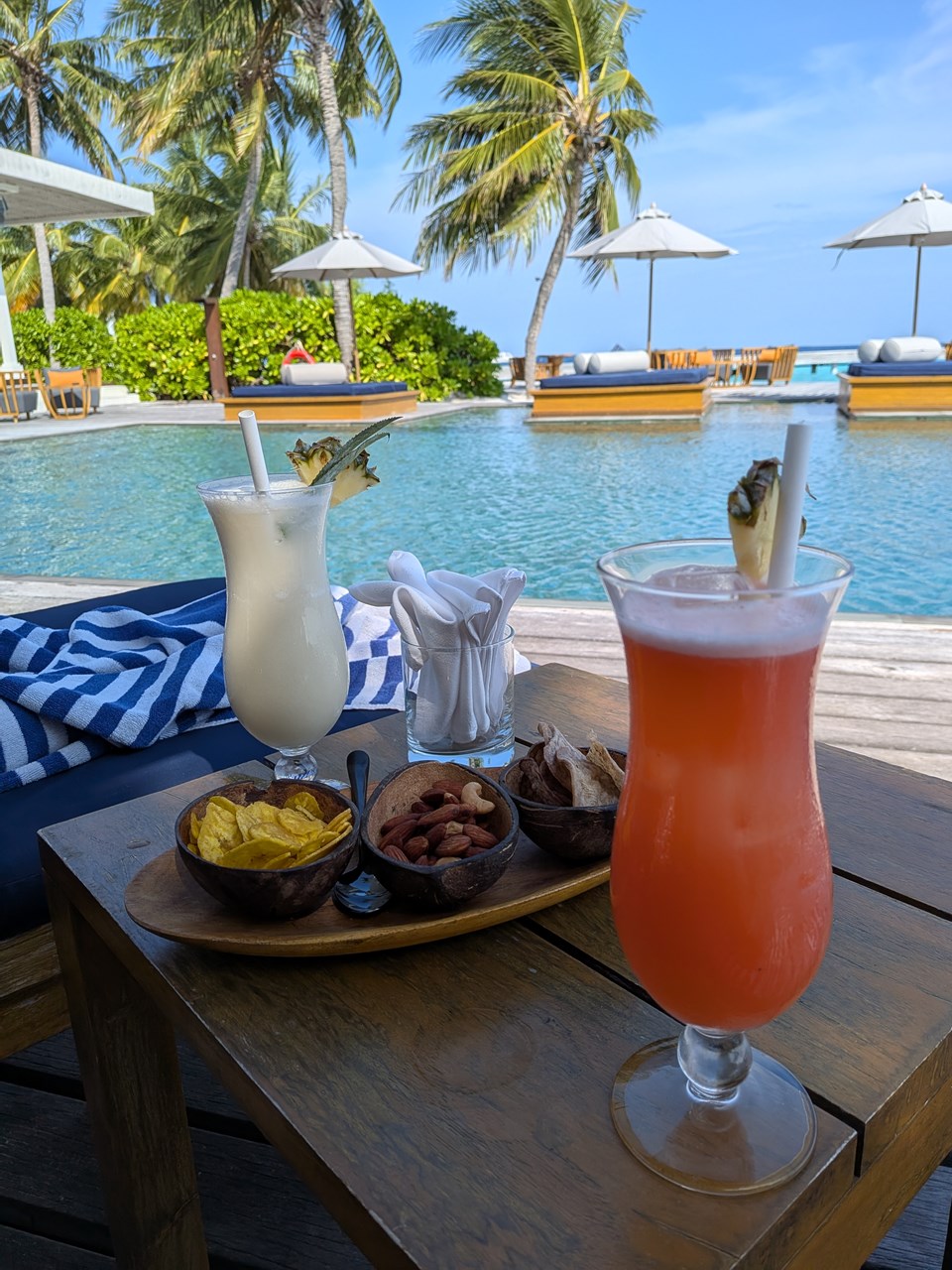 私たちのモルディブでの過ごし方というのは、ただひたすらにシュノーケルに行くというもので毎日2~4回は海に出ていました。その合間はメインプールで泳いだりデッキチェアでのんびりしたり、ラッフルズの代名詞とも言えるロングバーのシンガポールスリングを堪能したりと、昼間はほとんどヴィラにはいませんでした。メインプールは私たち以外の他のゲストがいることがほぼなく、基本的に貸し切り状態でした。またブティック横に卓球台があり、これも私たちしか使ってなかったかもしれません。
