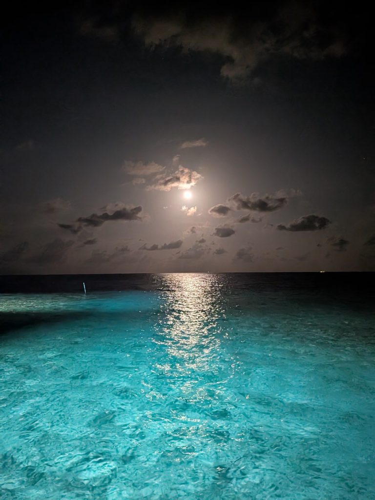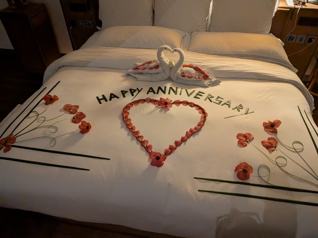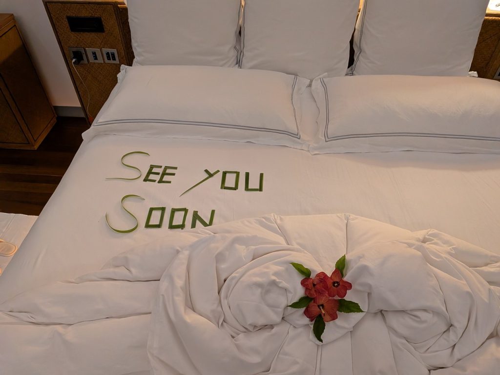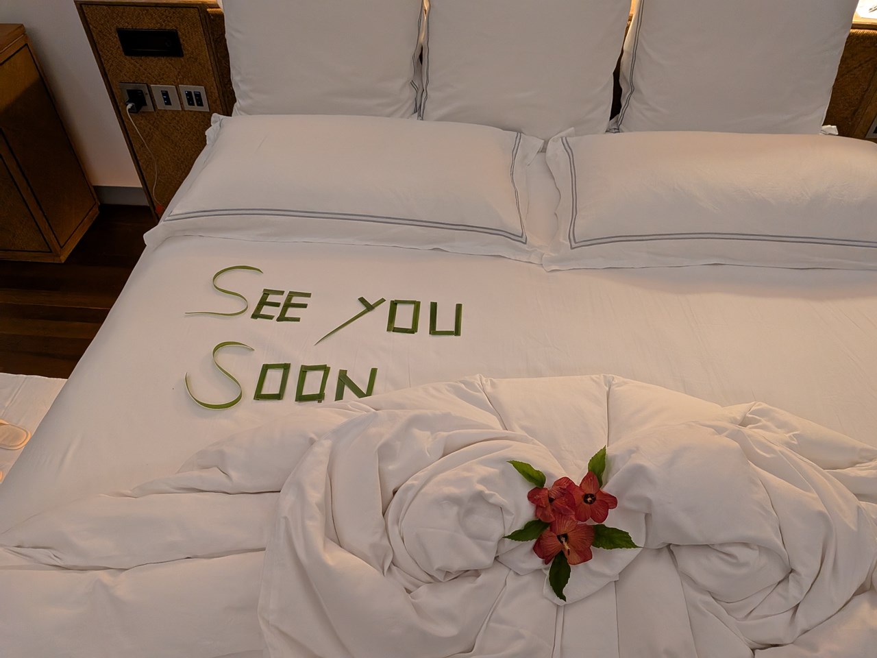 ラッフルズでは、ピキピキの枝珊瑚&テーブル珊瑚に囲まれながら透明度の濃いハウスリーフスノーケリングを存分に楽しまれ、昼下がりには静かなプール&バーでシンガポールスリングと共にまったりした時間を過ごされ、最高級のお食事を堪能されるという、上質なリゾートライフをお過ごしいただけたようで安心いたしました。また、ご結婚25周年をお祝いするラッフルズ流のおもてなし(バス&ベッドデコレーション)も本当にお洒落で、うっとりしてしまいました。そして、ラッフルズの海の色はやはり格別で、特に満月の灯りに照らされる夜の海の青さは、言葉では表現できないほど幻想的です。