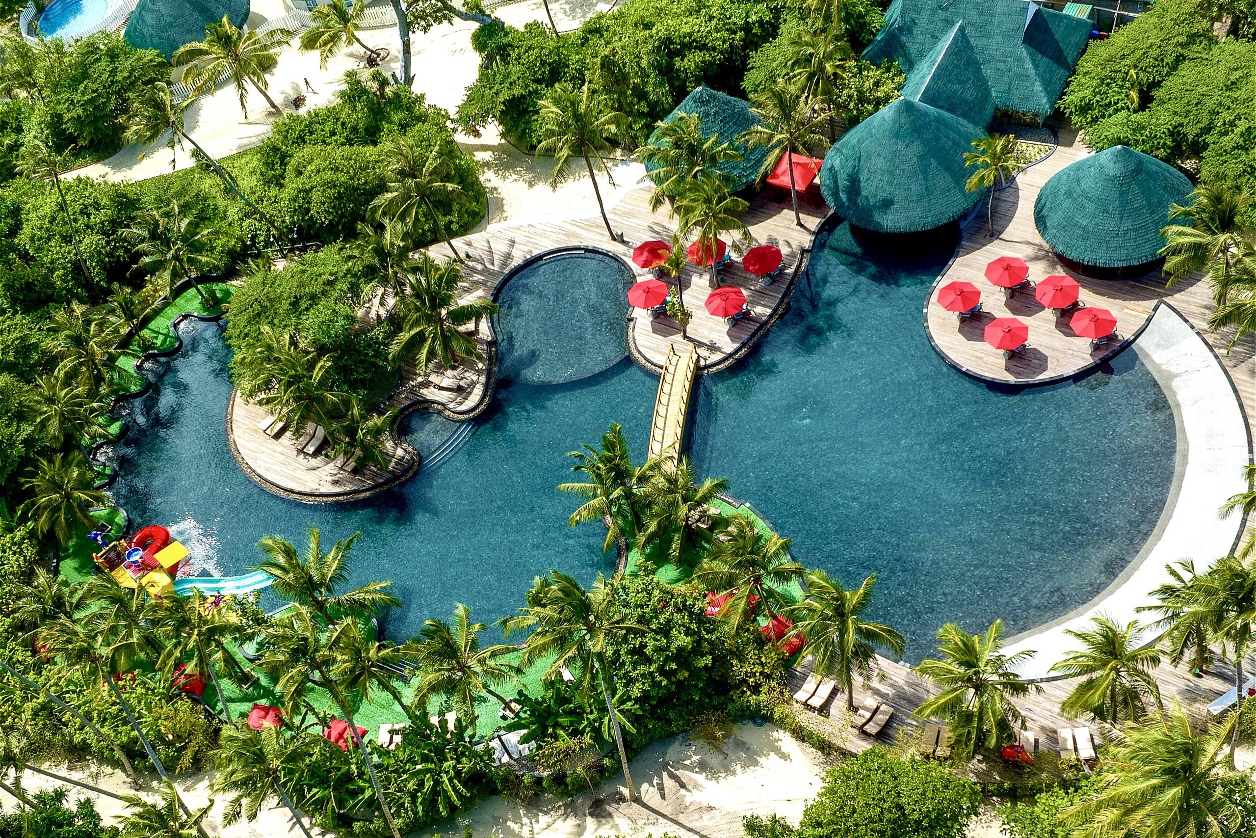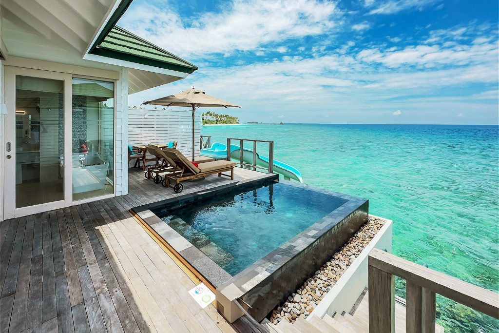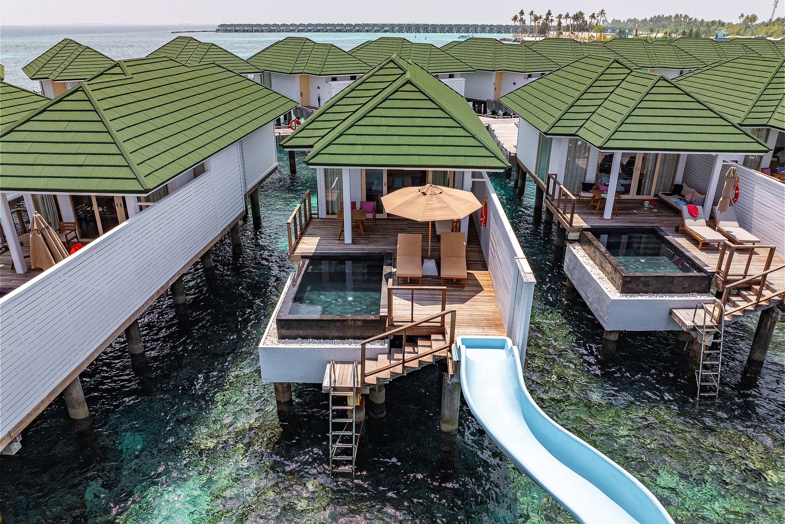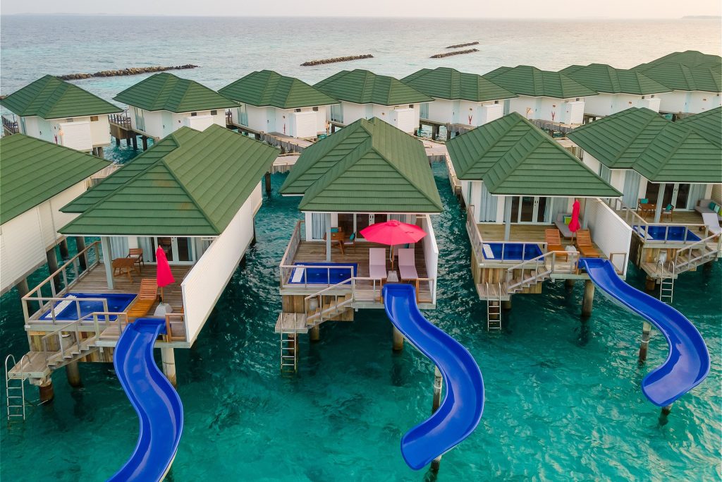 - 全水上ヴィラにスライダー付き