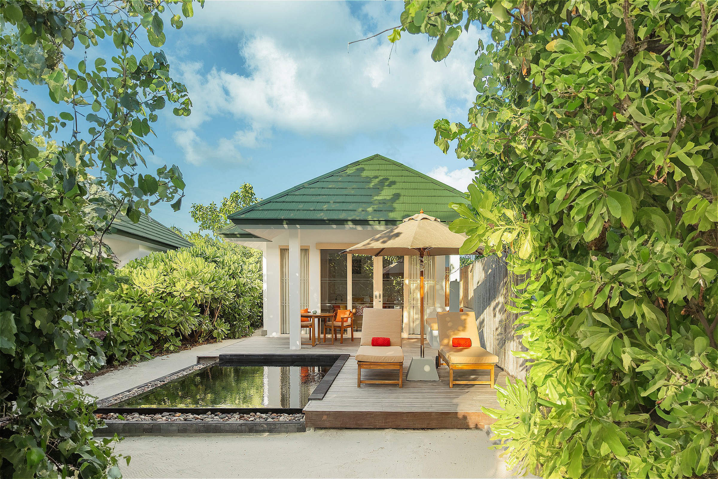 * 白砂ビーチ沿いに建つビーチタイプのヴィラは、豊かな緑に包まれたプライベート感あふれる空間