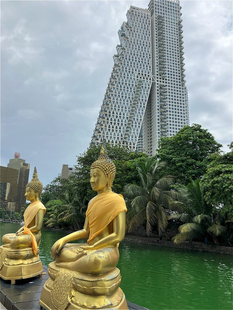 バワの世界観が投影されており、高層ビル群と湖をバックに黄金の仏像が並ぶ光景は、一見の価値あり!