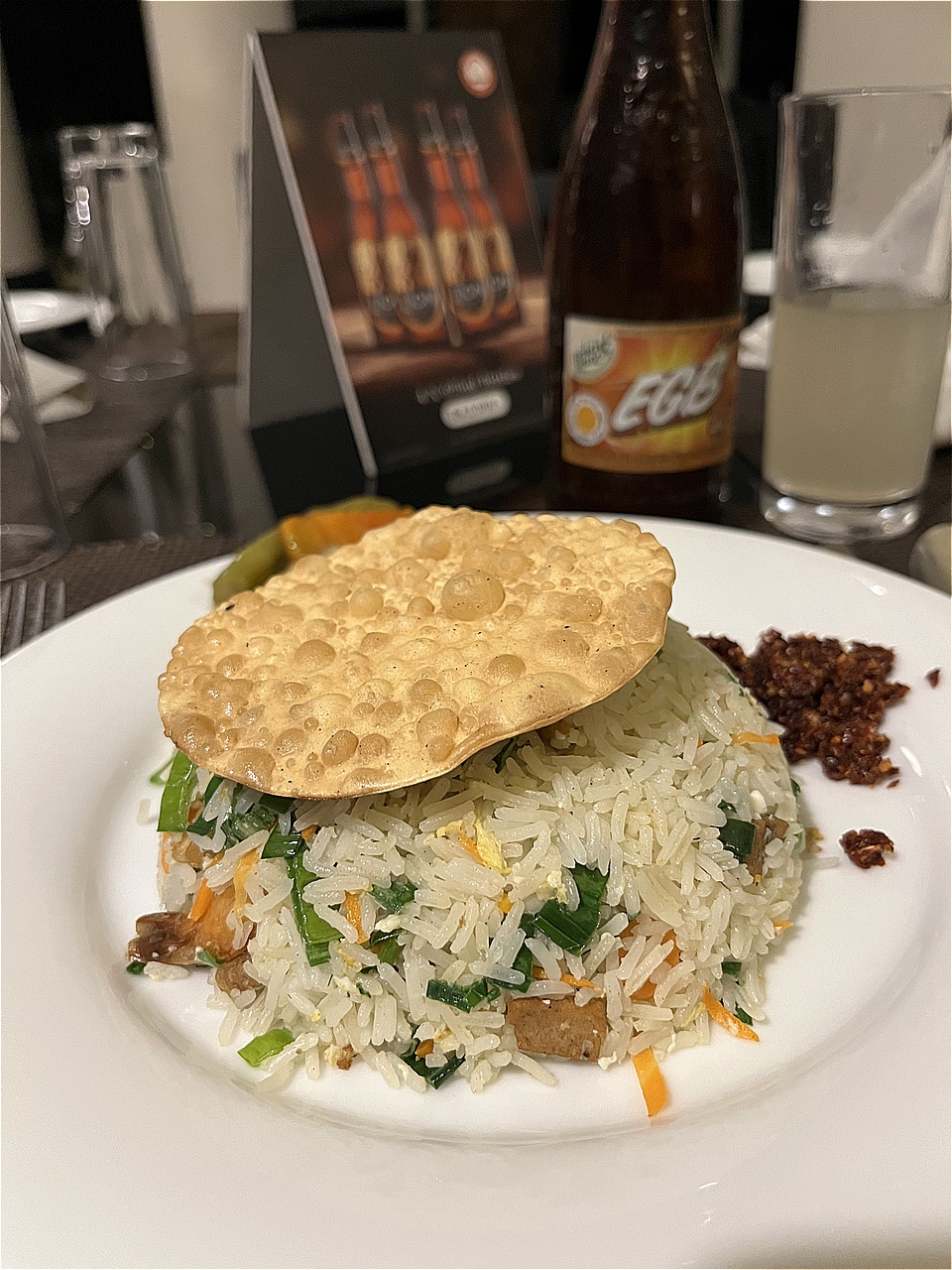 サーブされたプレートは私の知っているコットゥとは全く違った…けど、細長いごはんがいい感じ。チリペーストを混ぜながらおいしくいただいた。特大盛りだったので、半分食べるのがやっと。