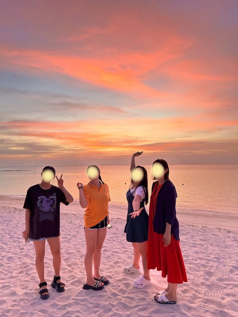 今回は年末年始の冬休みを利用され、お子様3名様(皆さま12歳以上)=計5名様でのファミリー旅行(水上ヴィラ2室利用)。今まで訪れたことのあるリゾート地ではなく、まだ見ぬモルディブの海で水上ヴィラを体験したいというお問合せをいただき、モルディブでも随一の海の美しさを誇るサン・シヤム・オルヴェリに決定されました。ご滞在中は、青空に映えるターコイズブルーの美しい海のみならず、夕日に染まるピンク色の海や、月の光が海に映し出されるムーンロードもご覧になられ、モルディブの美しさを存分にご堪能いただけたようで本当に良かったです。空と海とビーチすべてがピンク色に染まるファミリー写真は本当に素敵で微笑ましく、皆様の笑顔を拝見しているだけで心が温まります。